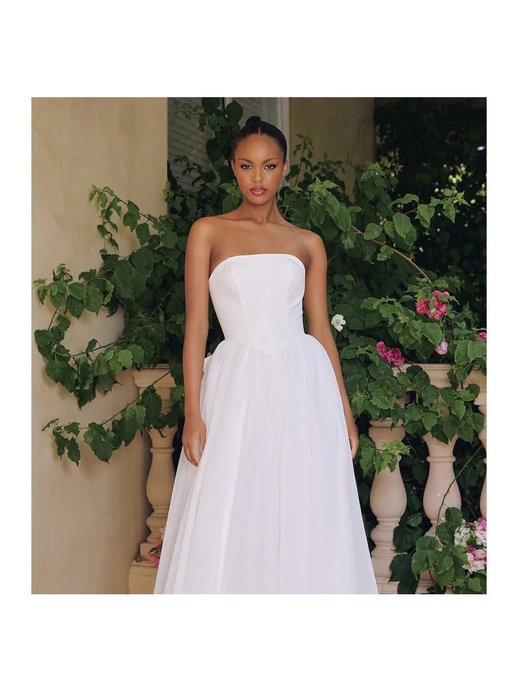 Představujeme vám model, který dokonale snoubí minimalistickou čistotu s působivým detailem. Přední část šatů sází na jednoduchost v podobě hladkého korzetu bez ramínek a rovný výstřih se všitými košíčky. Zadní strana šatů však skrývá překvapení, které z nich činí naprosto nepřehlédnutelný kousek. Dominantou je velká, precizně tvarovaná mašle s dlouhými splývavými konci, která dodává modelu nádech hravosti. Skvělým bonusem je, že je tato mašle odepínací. Bohatá tylová sukně tvořená několika vrstvami jemného tylu dodává modelu slavnostní efekt.