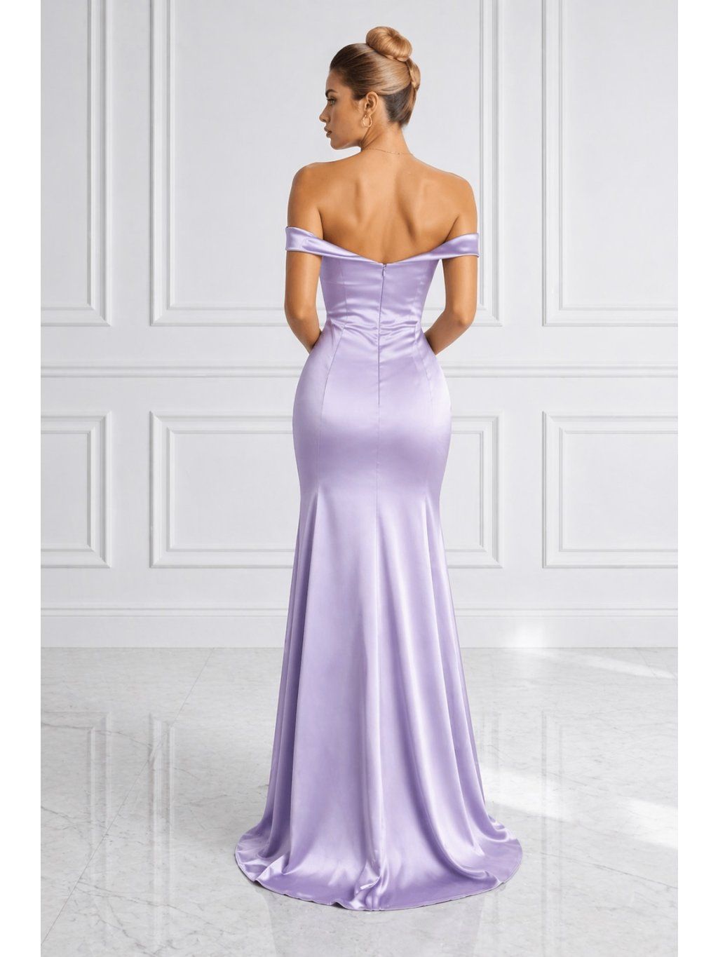 Tyto dlouhé šaty v okouzlujícím levandulovém odstínu jsou definicí moderní romantiky. Saténové šaty s vysokým leskem přitahují pozornost svou neobvyklou barvou, která působí velmi něžně a mladistvě. Dominantním prvkem je precizně vypracovaný korzet, jehož horní hrana je zakončena jemným vrstvením, zatímco spodní část korzetu vybíhá do špičky, čímž opticky prodlužuje trup a maximálně zdůrazňuje siluetu přesýpacích hodin. Velkou předností modelu je jeho přizpůsobivost díky přídavným ramínkům. Pokud toužíte po antickém vzhledu, nechte ramínka spadlá přes paže; pro odvážnější styl je stačí jednoduše odepnout a nechat vyniknout linii ramen v čistém korzetovém střihu.