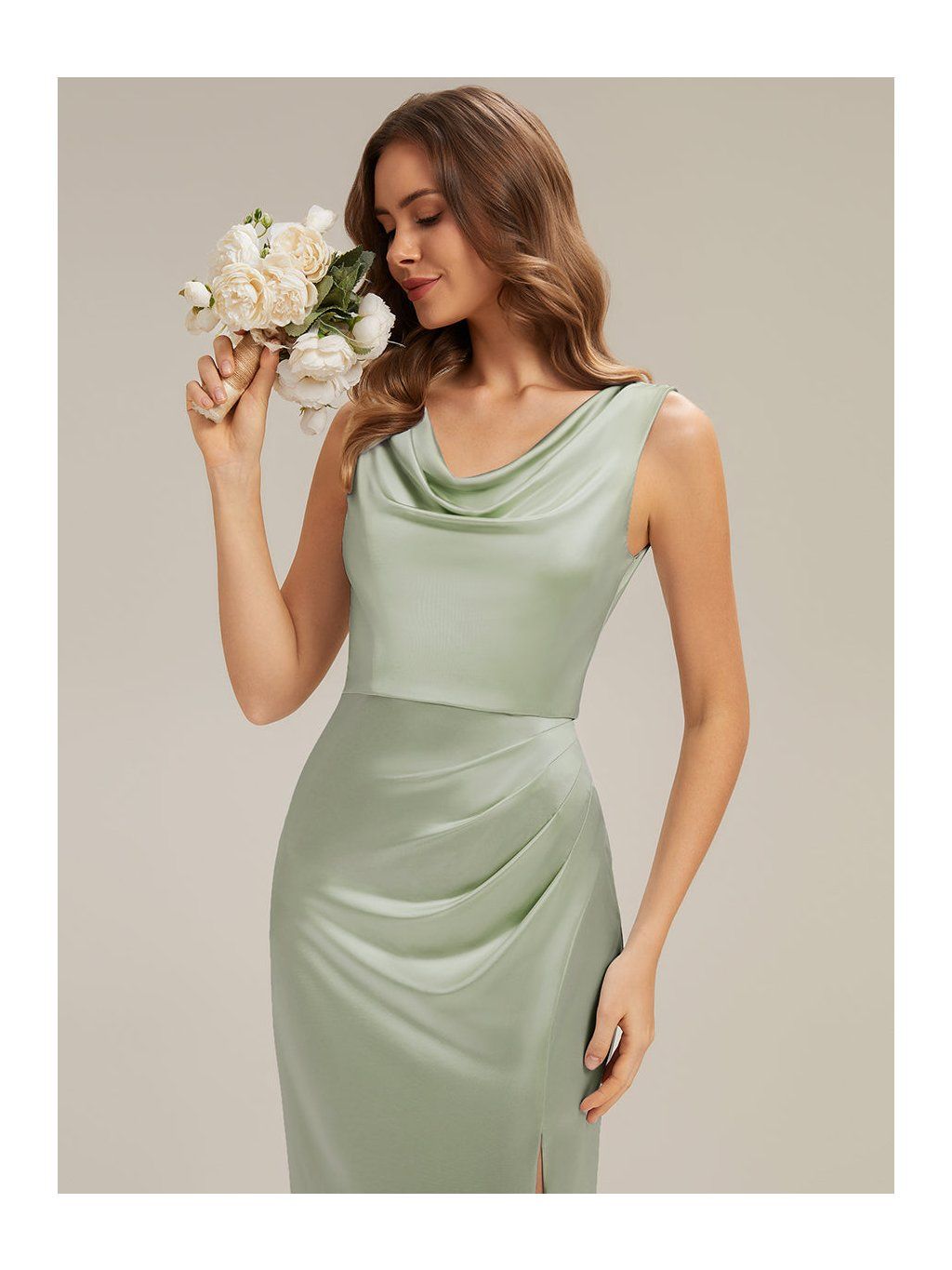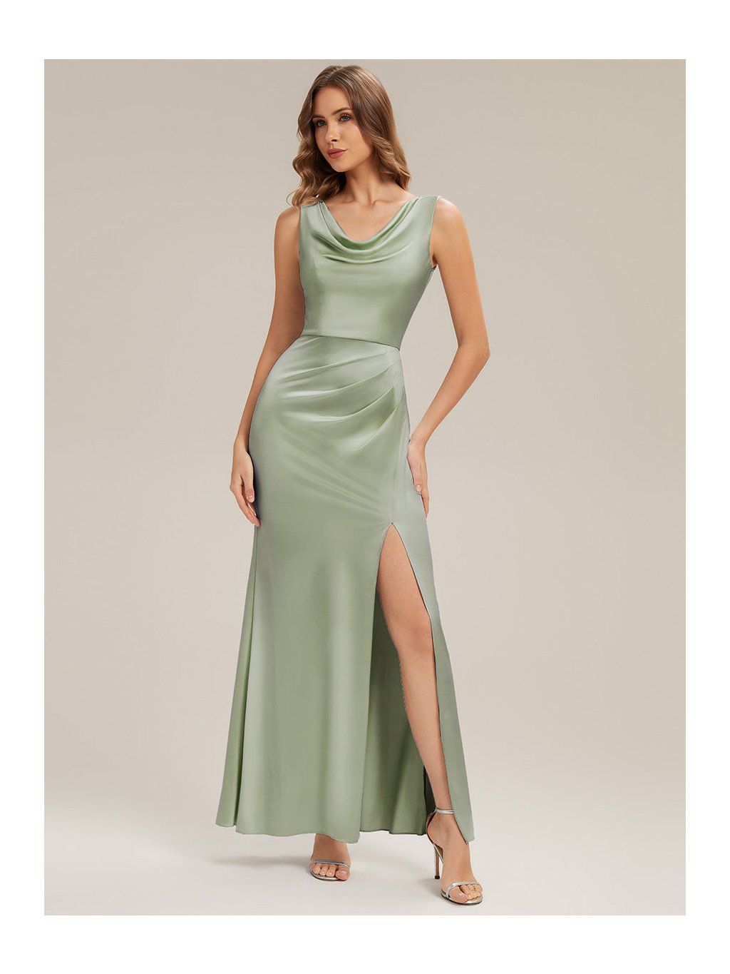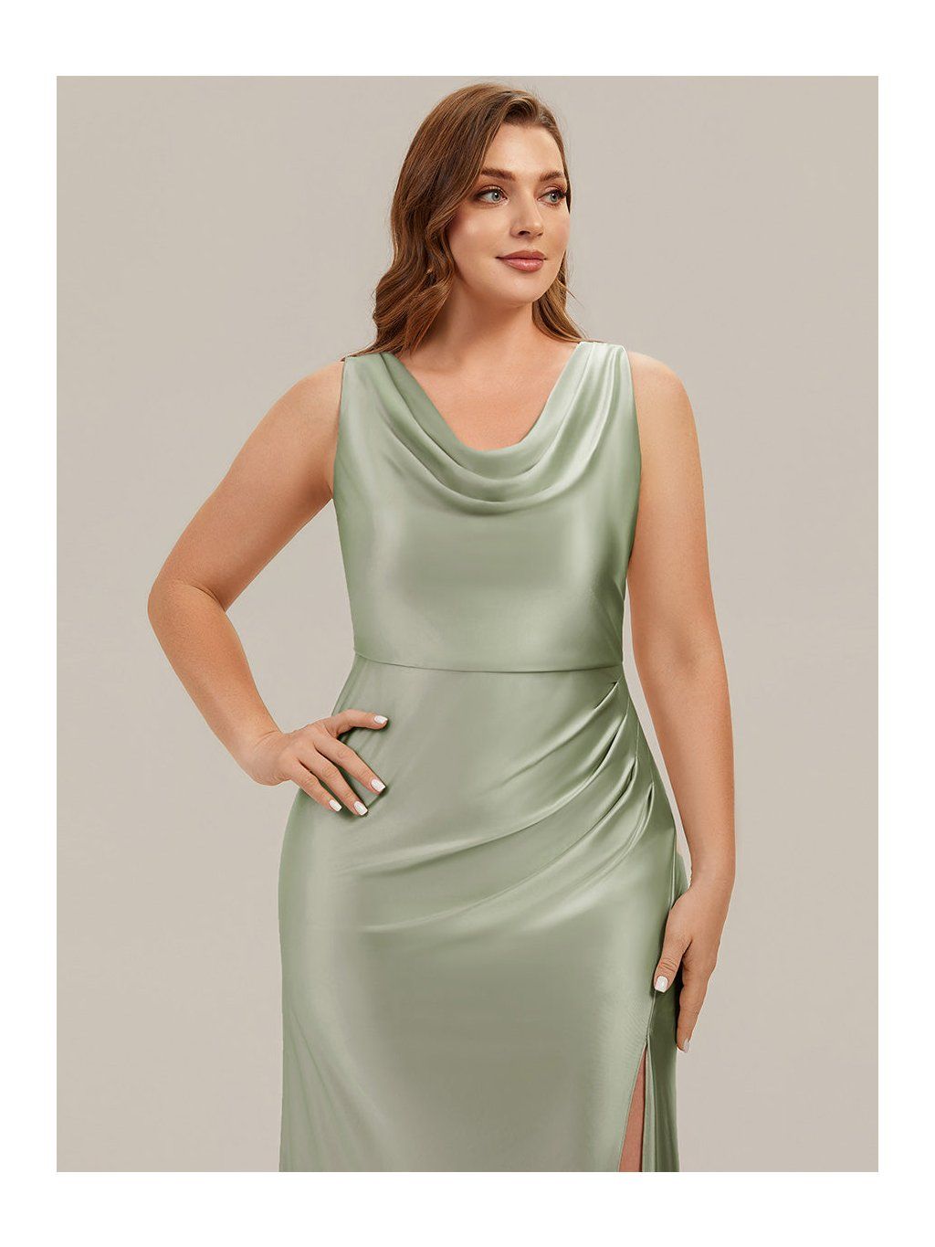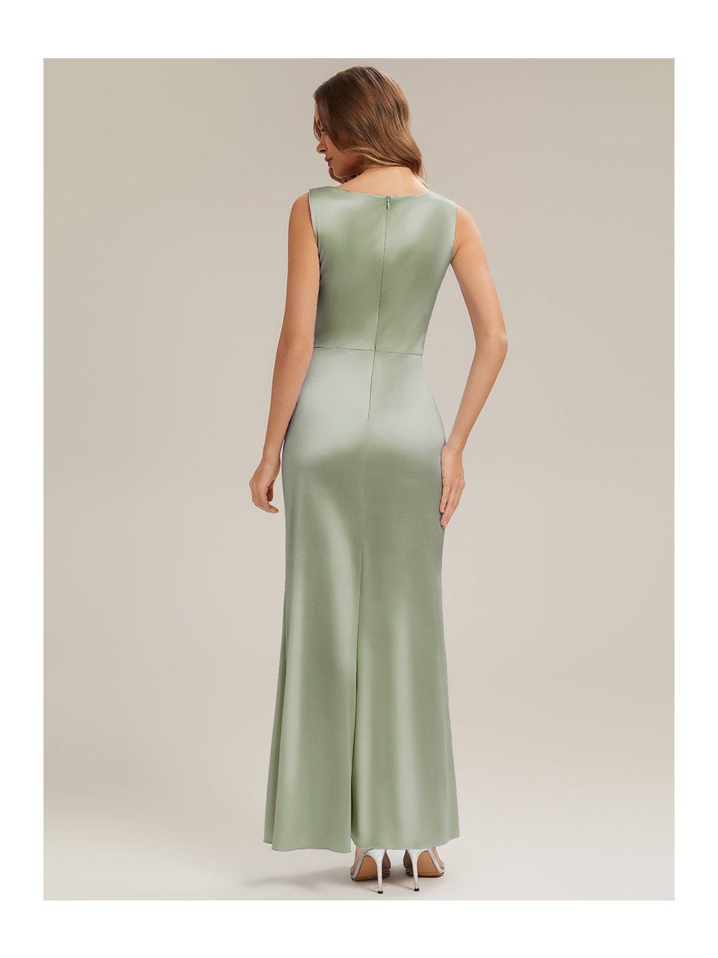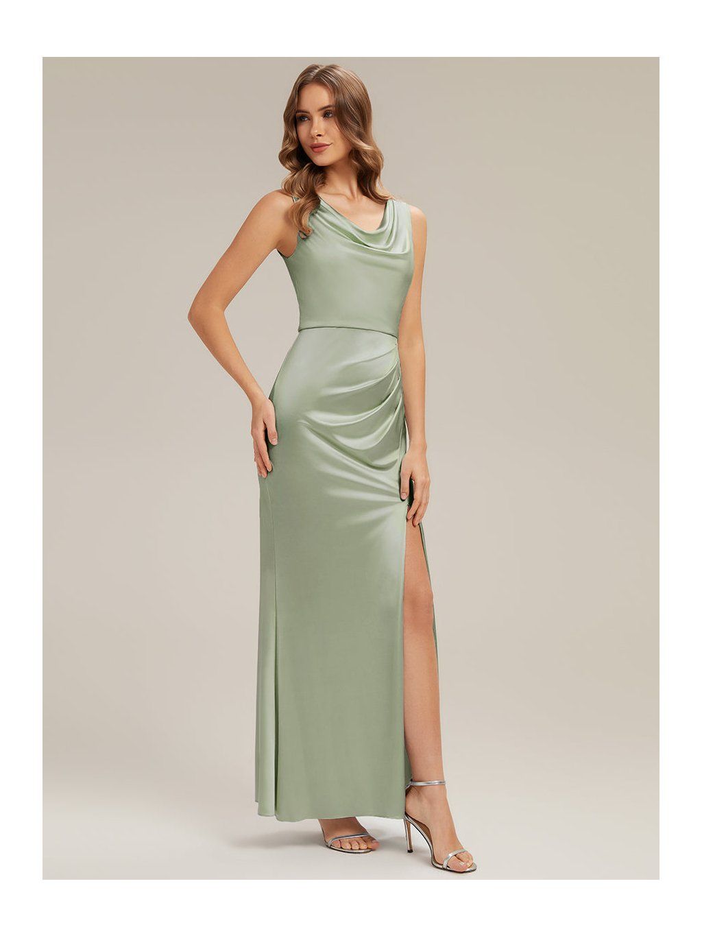 Saténové šaty v olivovém odstínu jsou řešené v přiléhavějším střihu, který plynule kopíruje linii těla. Horní část má mírně splývavý, vodopádový výstřih, který není pevně tvarovaný a vytváří měkký spád látky v oblasti dekoltu. V pase a přes boky je látka nařasená. Tento detail přirozeně navazuje na rozparek, který vychází z přední části sukně a otevírá se při chůzi. Materiál je hladký satén s lehkým leskem, který zvýrazňuje pohyb a drží jednoduchou linii. Zadní část je bez výrazných prvků, se skrytým zipem.