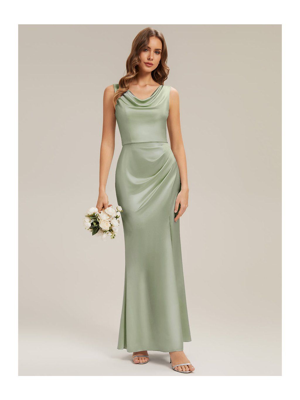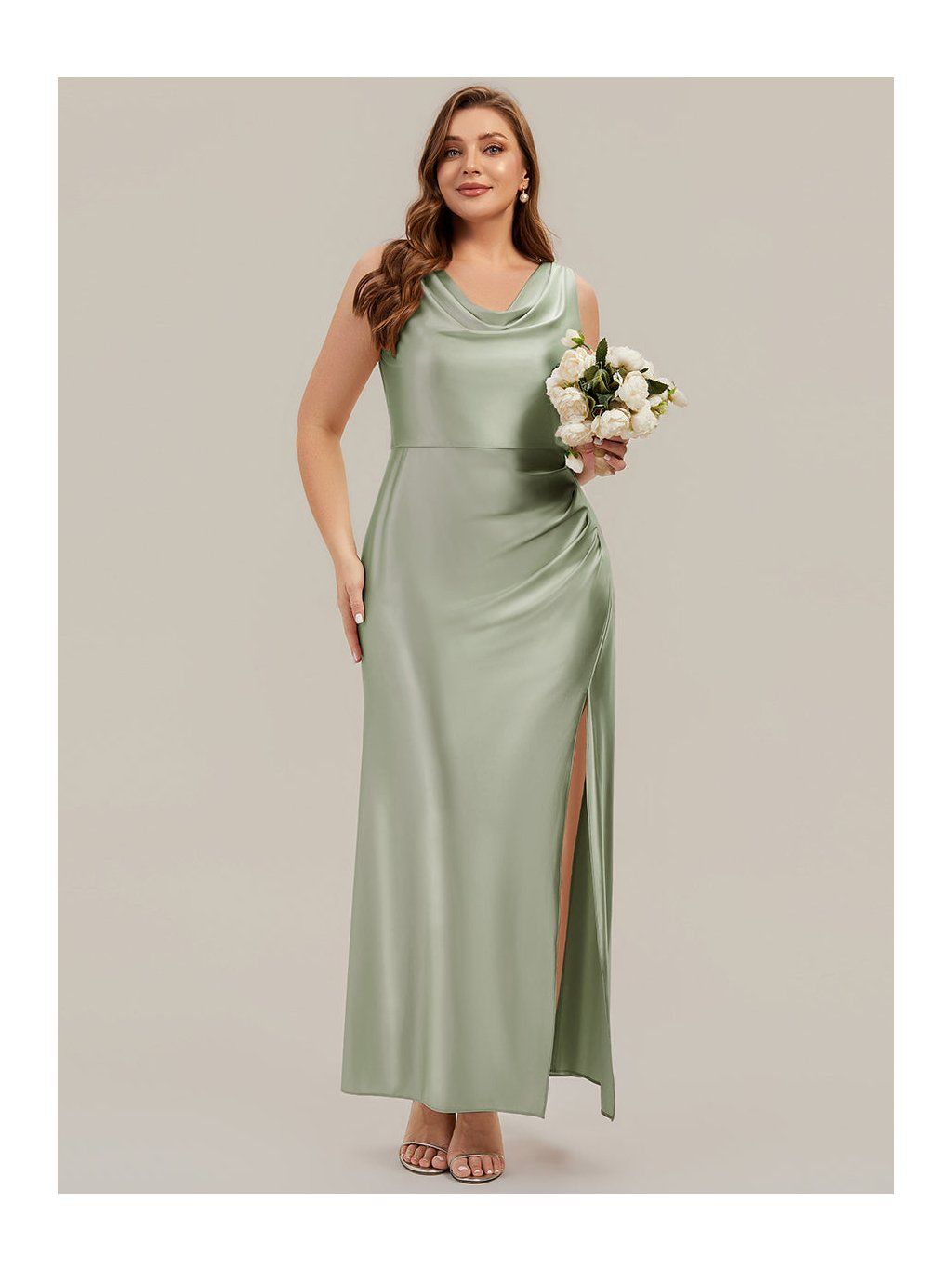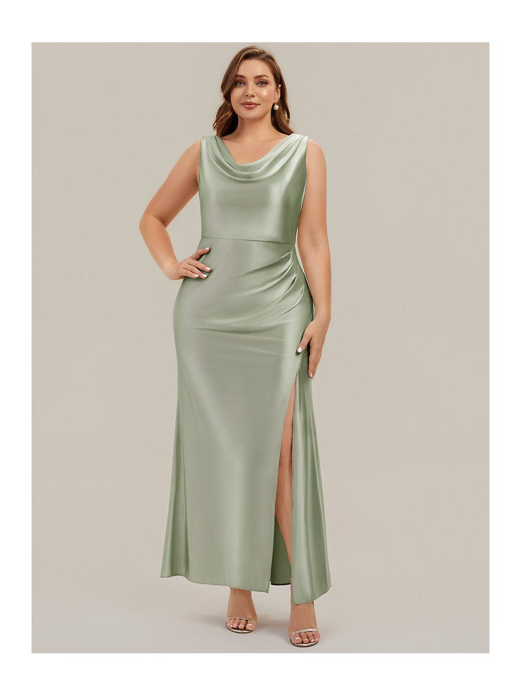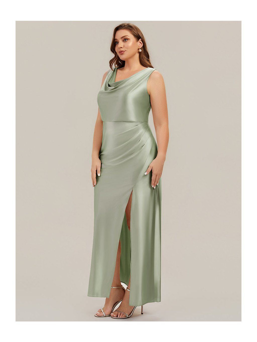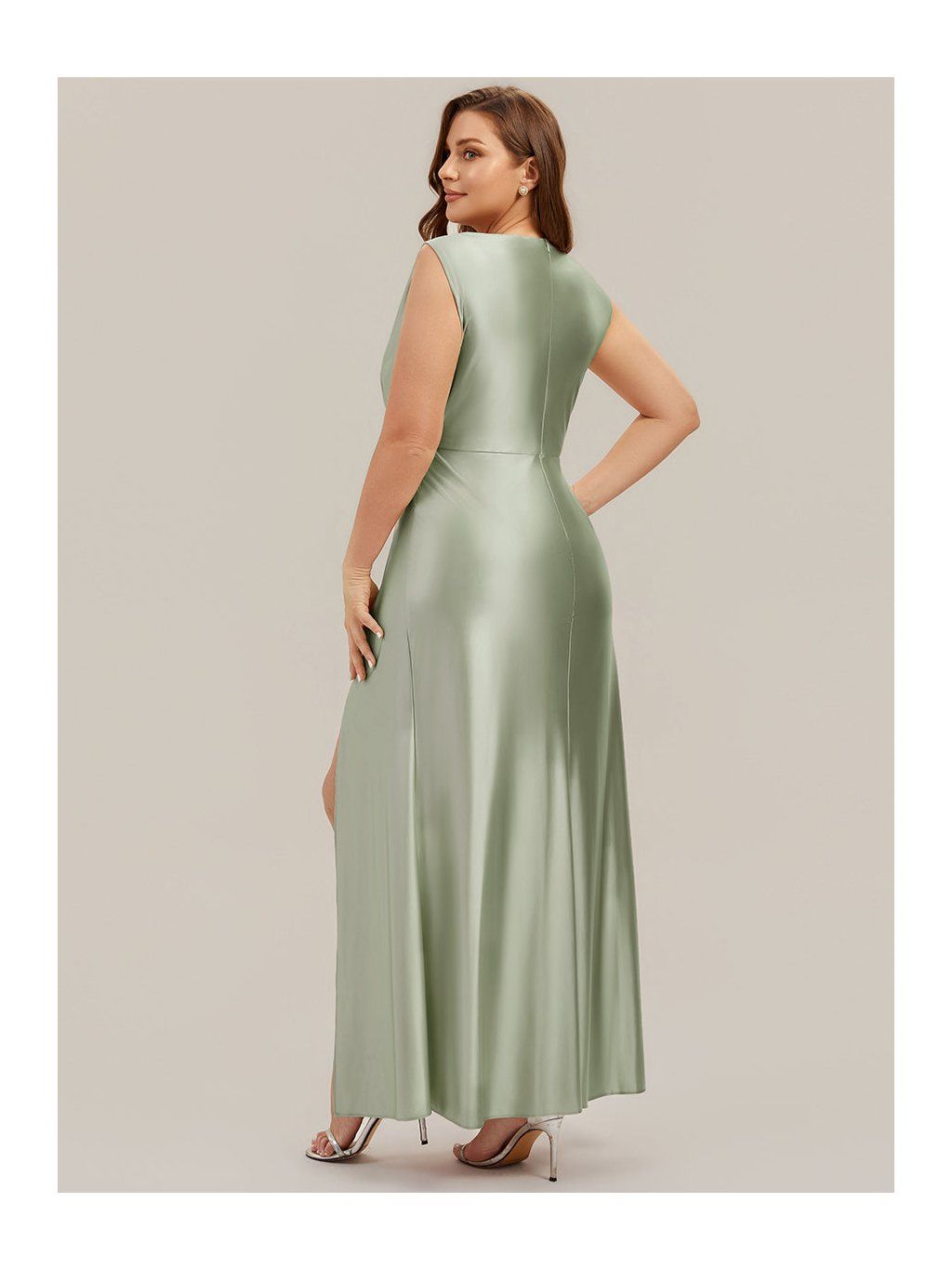 Saténové šaty v olivovém odstínu jsou řešené v přiléhavějším střihu, který plynule kopíruje linii těla. Horní část má mírně splývavý, vodopádový výstřih, který není pevně tvarovaný a vytváří měkký spád látky v oblasti dekoltu. V pase a přes boky je látka nařasená. Tento detail přirozeně navazuje na rozparek, který vychází z přední části sukně a otevírá se při chůzi. Materiál je hladký satén s lehkým leskem, který zvýrazňuje pohyb a drží jednoduchou linii. Zadní část je bez výrazných prvků, se skrytým zipem.