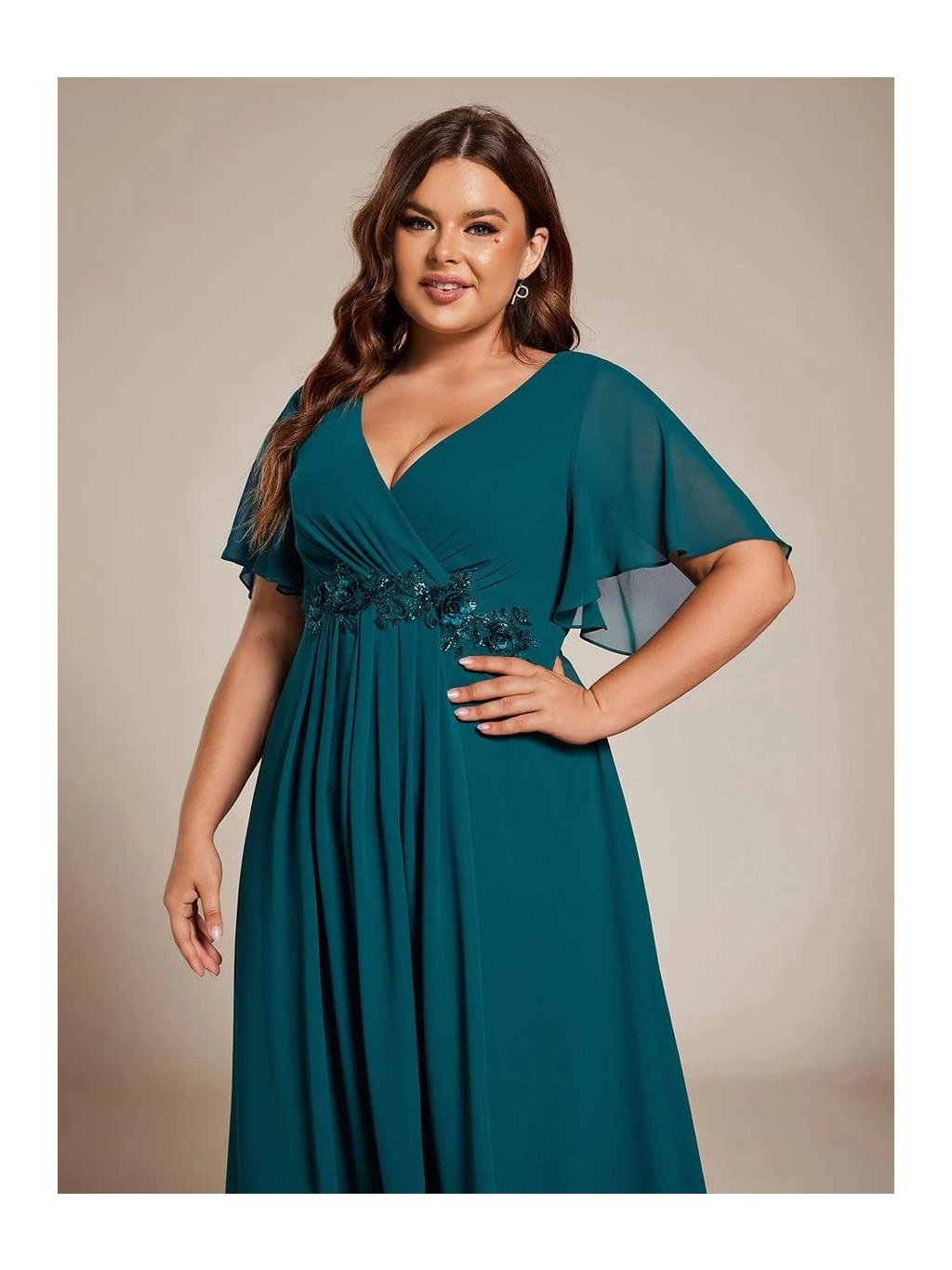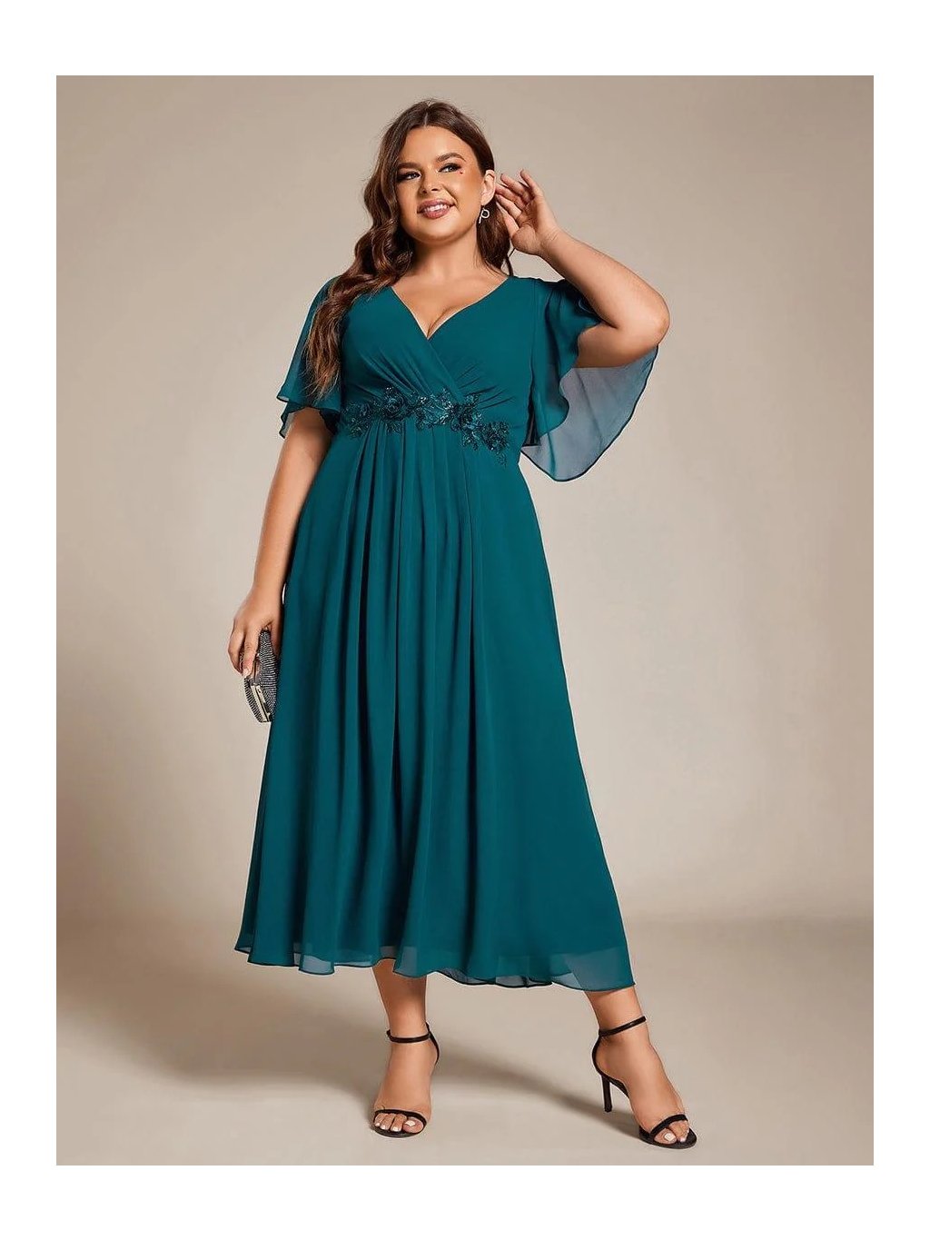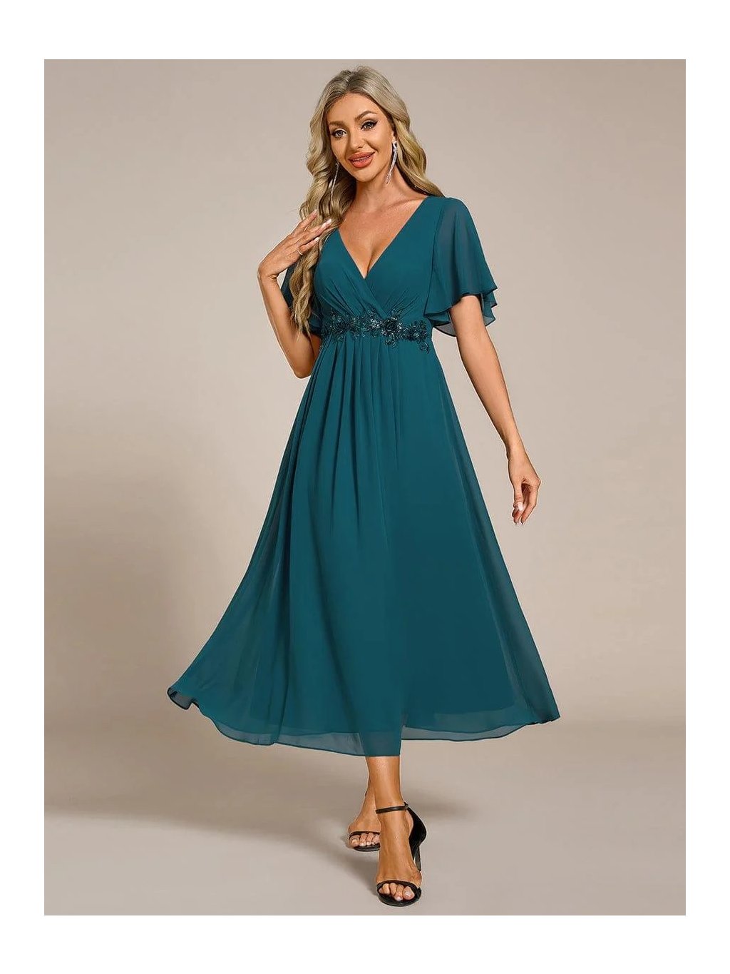 Tyto midi společenské šaty v petrolejovém odstínu působí velmi lehce a přirozeně ženským dojmem. Překládaný výstřih do V spolu s jemným řasením v oblasti prsou opticky tvaruje horní část postavy a zvýrazňuje dekolt. Zvýšený pas pak krásně prodlužuje siluetu. Šaty jsou ušité z šifonu, který se při chůzi elegantně pohybuje a vytváří vzdušný efekt. Sukně je volně rozšířená do A, díky čemuž neobepíná boky a působí velmi pohodlně i při delším nošení. V pase je umístěná decentní aplikace z flitrů, která dodává modelu zajímavý detail a opticky odděluje horní a spodní část.