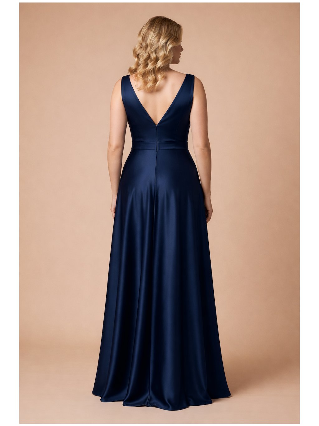 Tento dlouhý plesový model v tmavě modré barvě působí nadčasově a velmi univerzálně. Véčkový výstřih s decentní vsadkou v dekoltu vytváří vyvážený vzhled a nechává vyniknout horní část postavy. Hladký živůtek plynule navazuje na pas a přirozeně formuje siluetu. Jemně lesklý materiál sukně se při chůzi krásně pohybuje a podtrhuje slavnostní charakter celého modelu. Šaty se skvěle hodí na maturitní, imatrikulační, taneční plesy, galavečery i jiné slavnostní akce, kde je kladen důraz na eleganci a čistý styl.