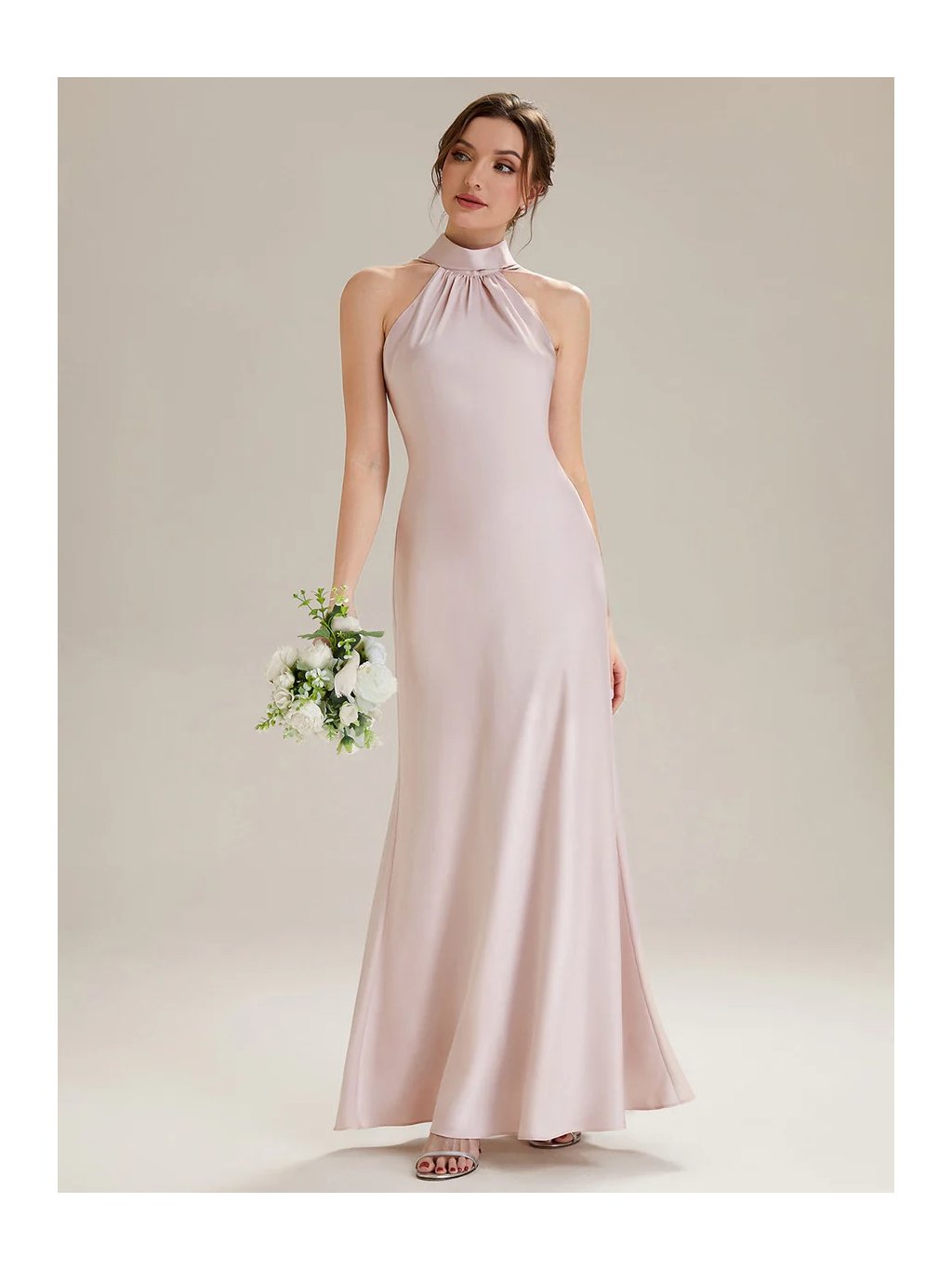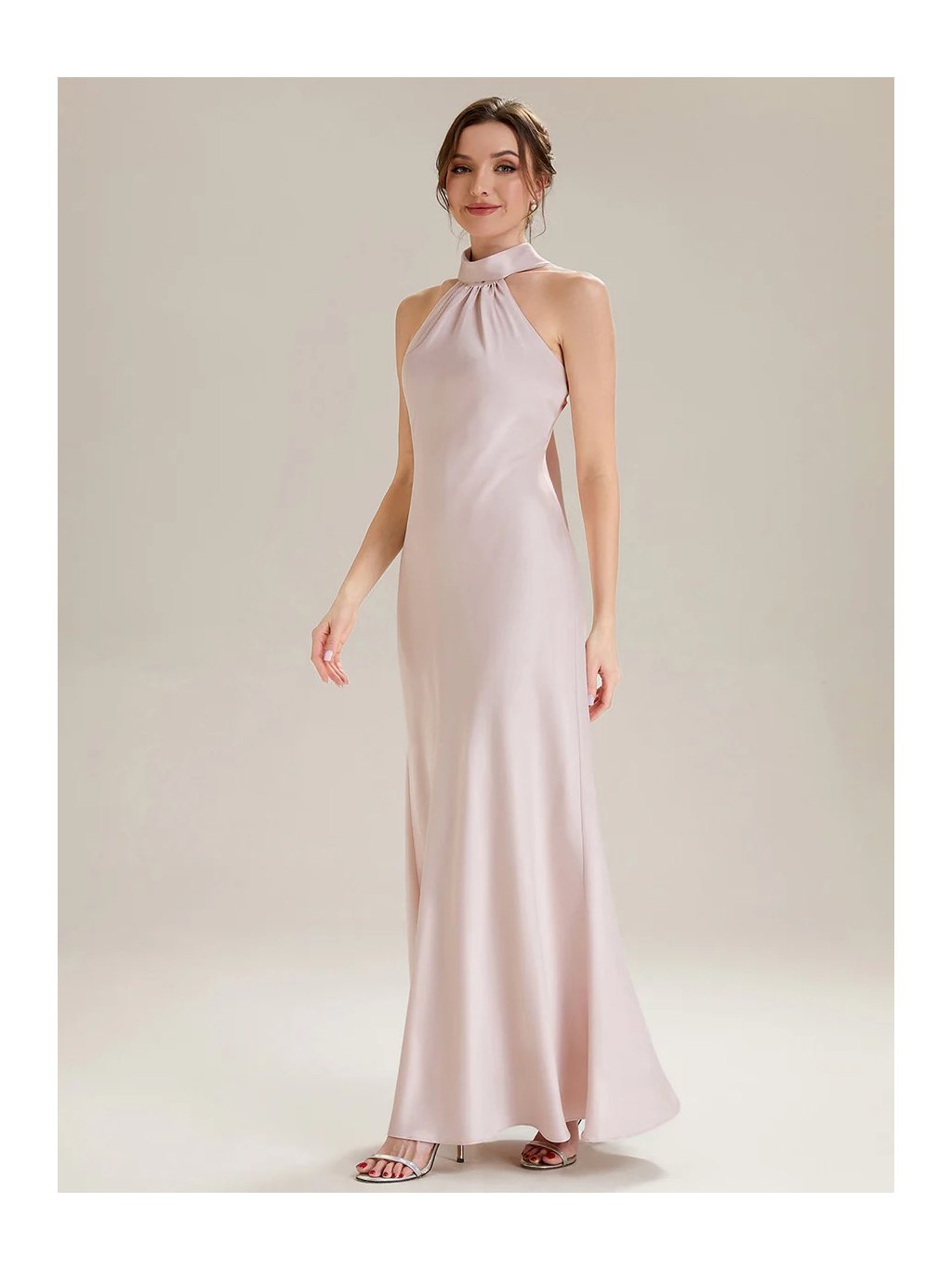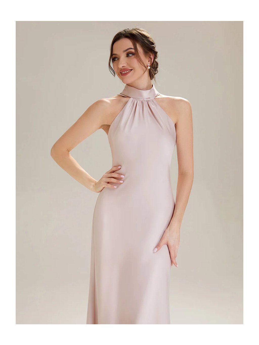 Tyto dlouhé společenské šaty vynikají čistou linií a jemným leskem saténu, který působí na postavě velmi lichotivě. Halter výstřih opticky prodlužuje krk a zvýrazňuje ramena, zatímco splývavá sukně volně kopíruje křivky bez zbytečného objemu. Výsledkem je ženská silueta, která působí přirozeně. Materiál má hladký, lehce chladivý povrch a krásně reaguje na pohyb i světlo. Díky tomu šaty působí živě při chůzi i tanci. Zadní část je řešena otevřenými zády s dlouhým šálovým detailem, který volně splývá a dodává modelu výrazný, ale stále vkusný prvek.
