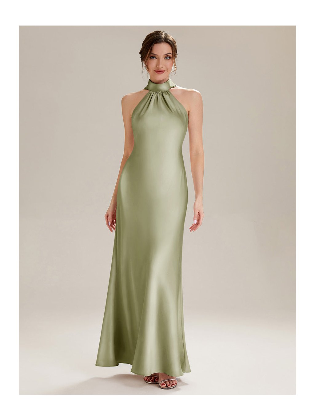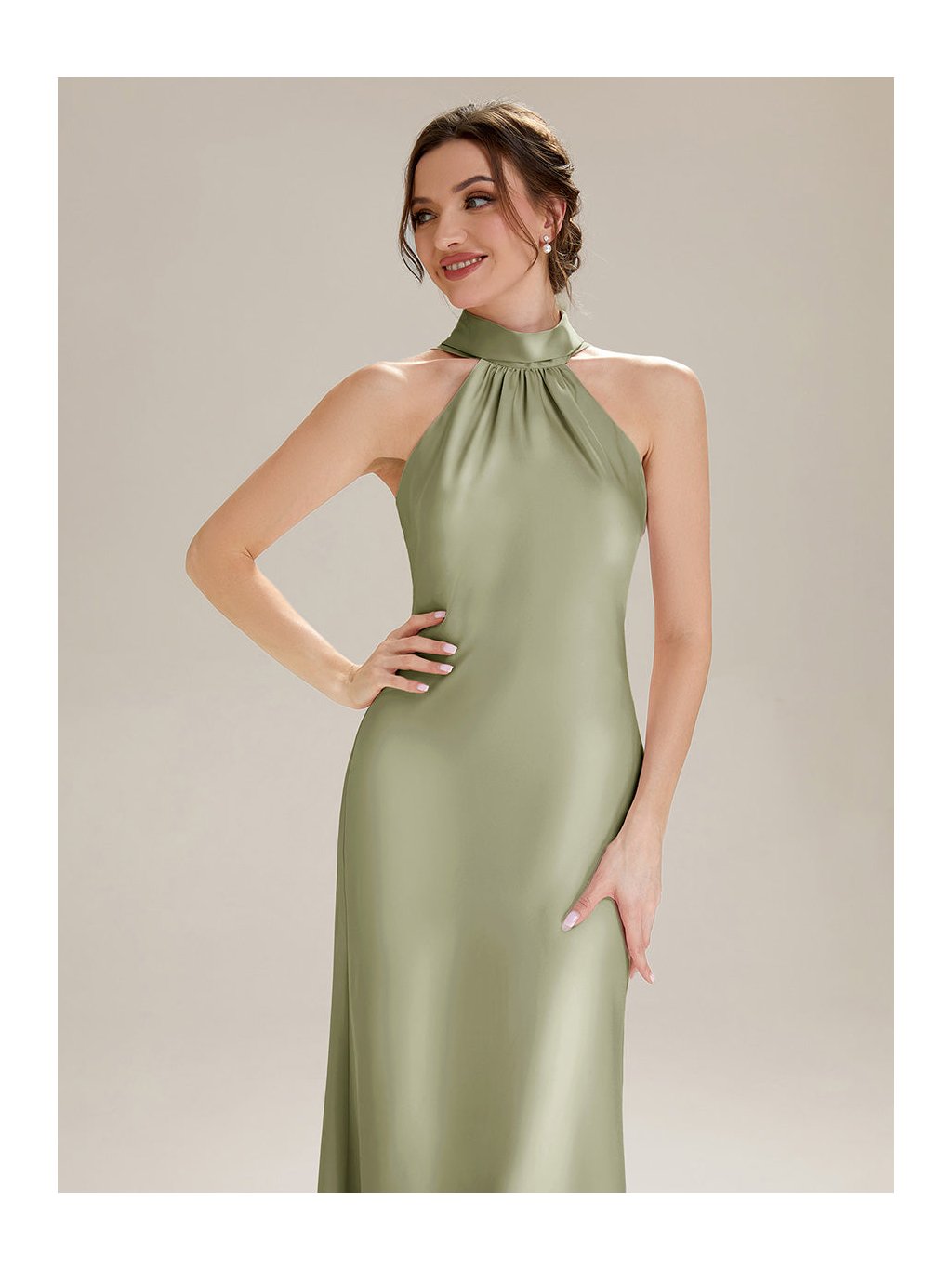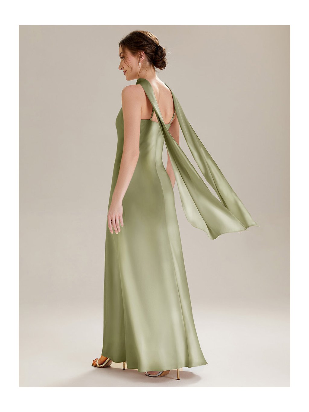 Minimalismus, který působí luxusně na první pohled. Tyto dlouhé šaty v jemném olivovém tónu zaujmou hladkou siluetou a efektním halter výstřihem s lehkým řasením u krku. Odhalená ramena a záda vytvářejí čistou, ženskou linii, kterou podtrhuje splývavý satén s decentním leskem. Zadní část zdobí prodloužené šálové pásy, které se při pohybu elegantně vznášejí. Model je ideální volbou na svatbu, formální recepci i moderní ples. Působí sebejistě, klidně a velmi vytříbeně.