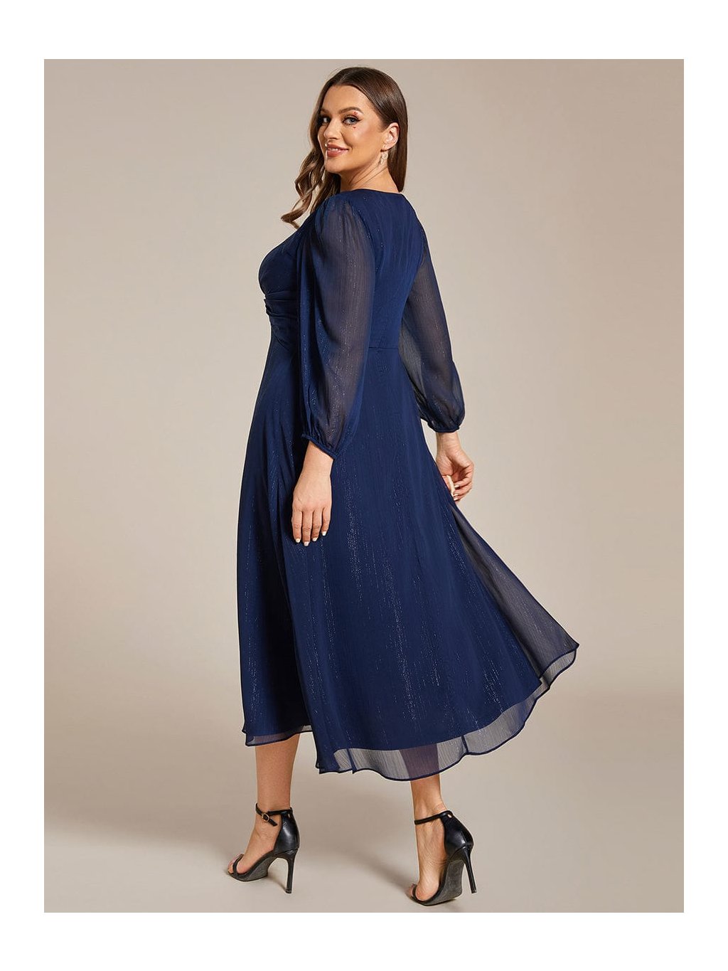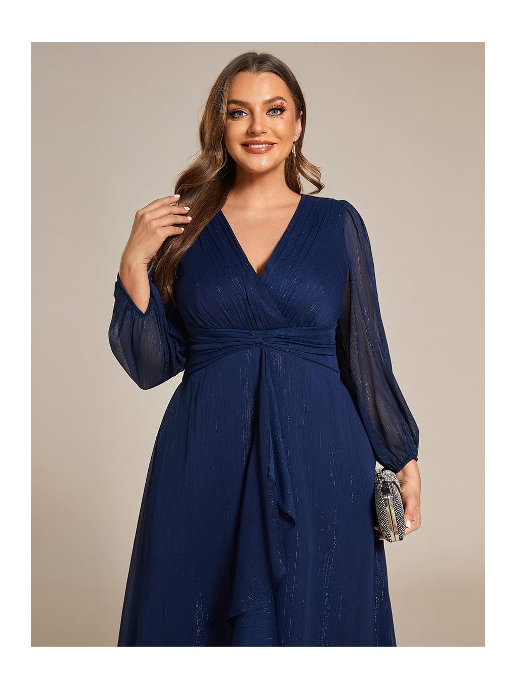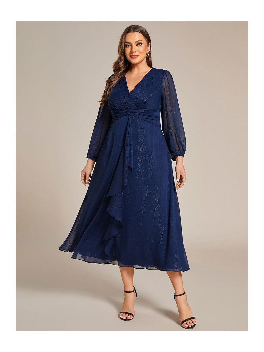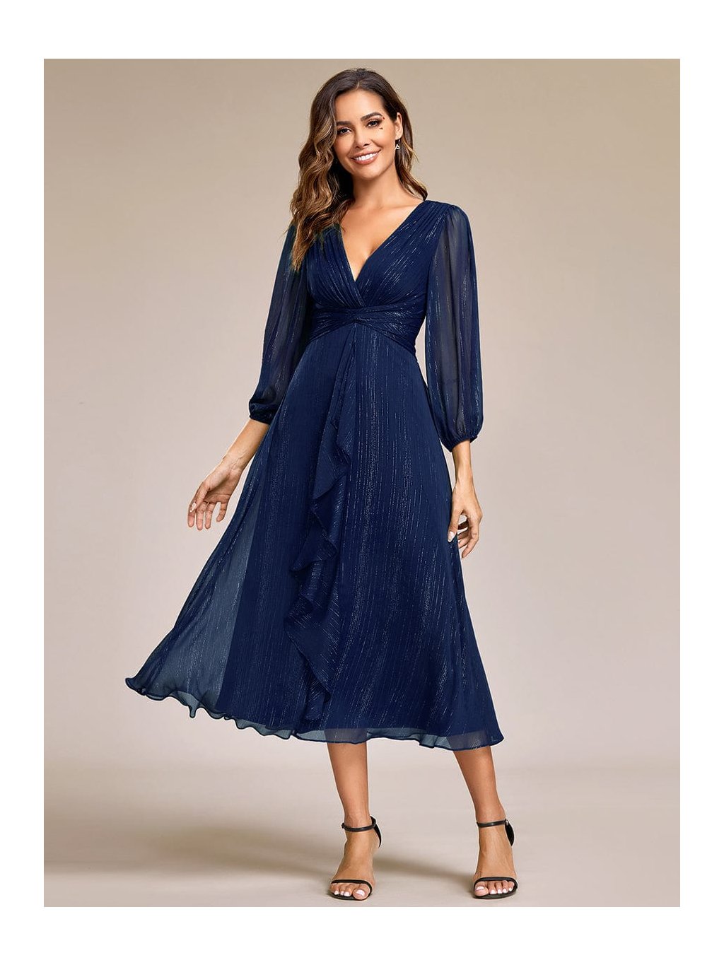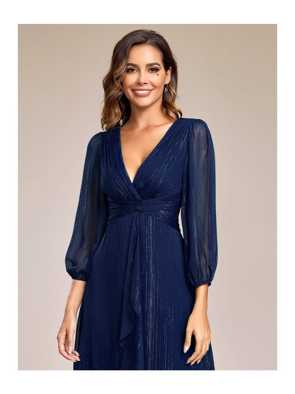 Něžné šaty v tmavě modrém tónu s detaily lesklých třpytivých nitek potěší každou ženu, která se chystá jít do tanečních, na ples nebo do divadla. Vypadají