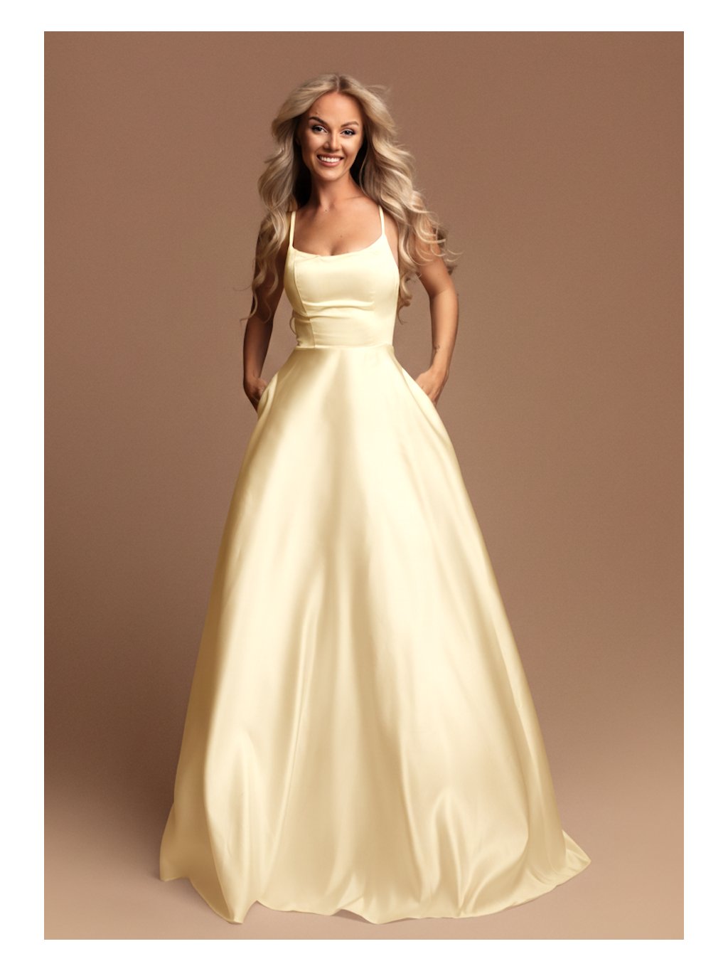 Šněrování na zádech umožňuje dokonalé přizpůsobení postavě a zajišťuje perfektně padnoucí siluetu. Lesklá, hladká saténová látka v jemném odstínu žluté krásně odráží světlo a v kombinaci s kolovou sukní vytváří lehký, vzdušný efekt, díky kterému se budete cítit slavnostně, pohodlně a výjimečně po celý svatební den.