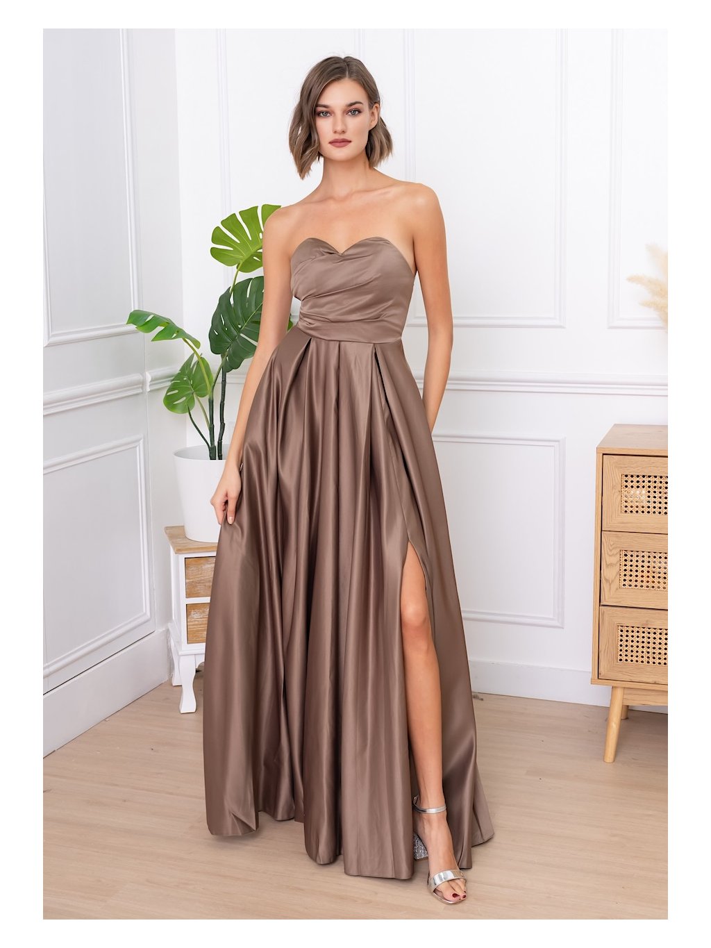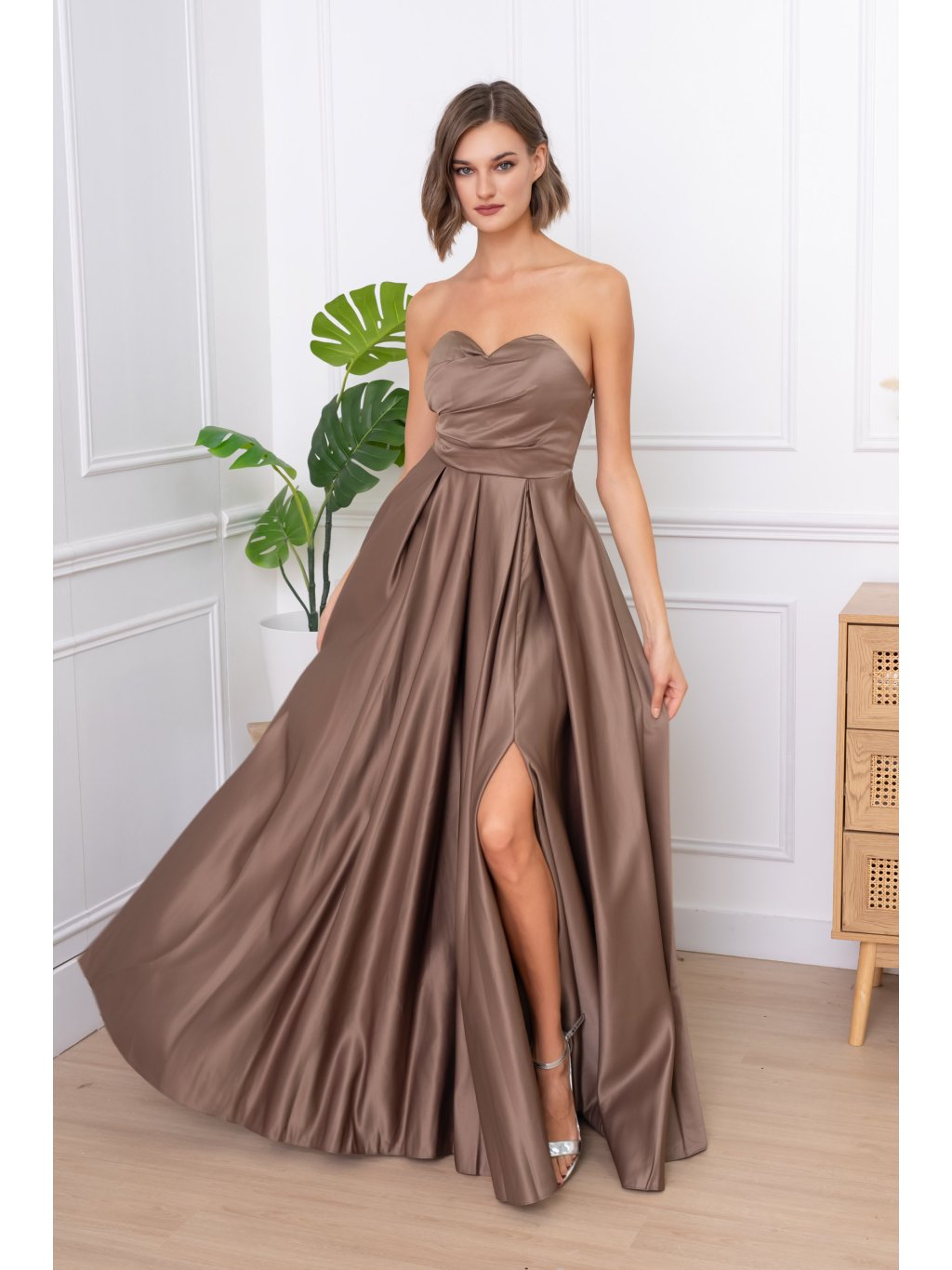 Na svatbu nebo slavnostní večer jako stvořené — bronzově hnědé saténové šaty, které propojují elegantní střih s moderním šarmem. Lesklý materiál jemně hraje se světlem a při pohybu vytváří plynulý efekt. Výstřih ve tvaru srdce spolu se šněrováním na zádech podtrhne ženskou siluetu, decentní rozparek navíc dodá šatům lehkost i jistou dávku odvážnosti. Model, který zaujme na první pohled a zůstane nezapomenutelný, možná také díky praktickým kapsám, jimiž je opatřen.