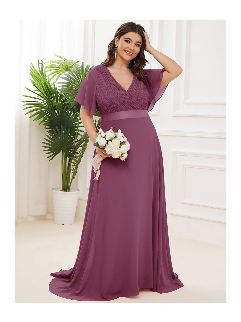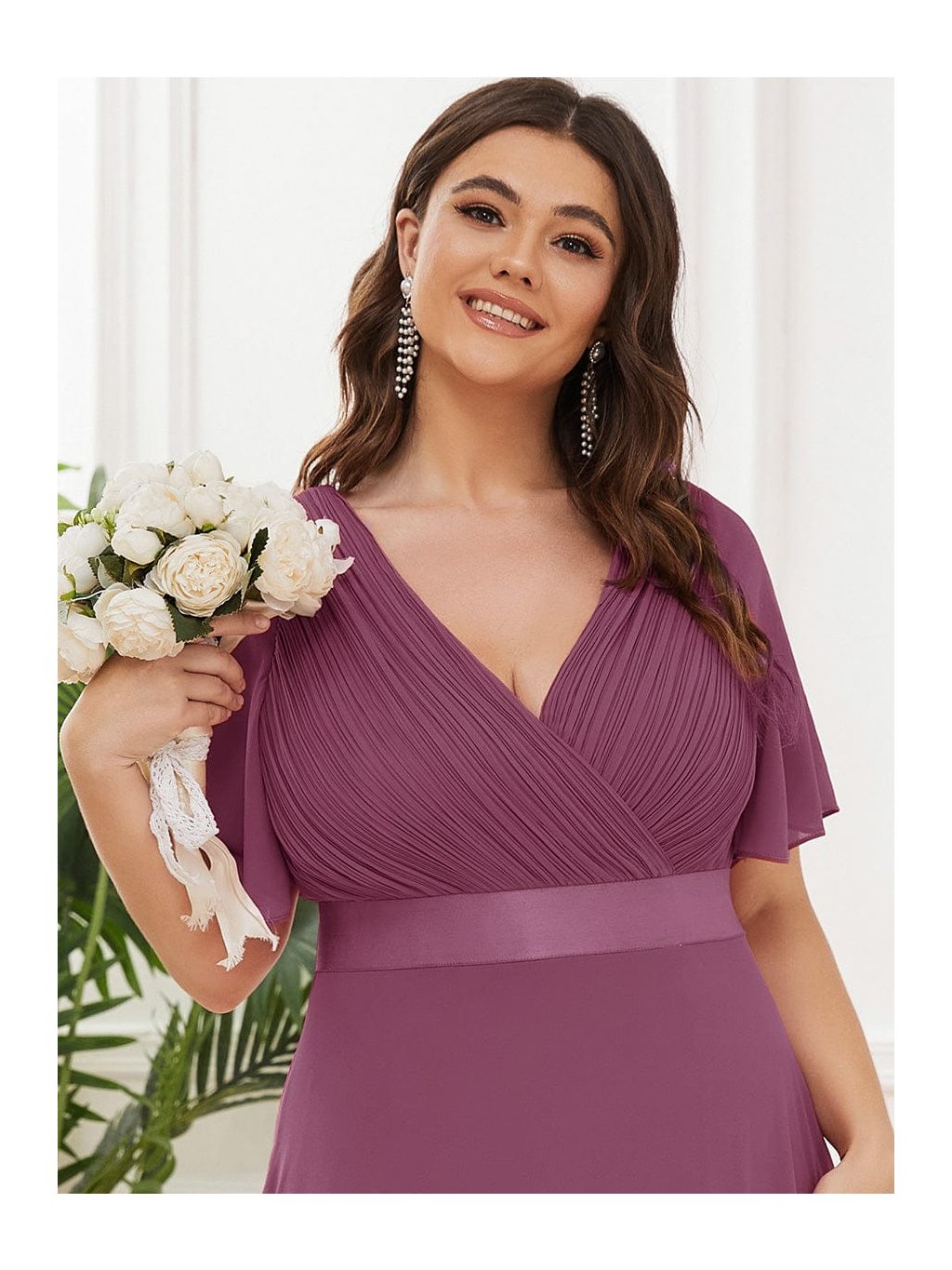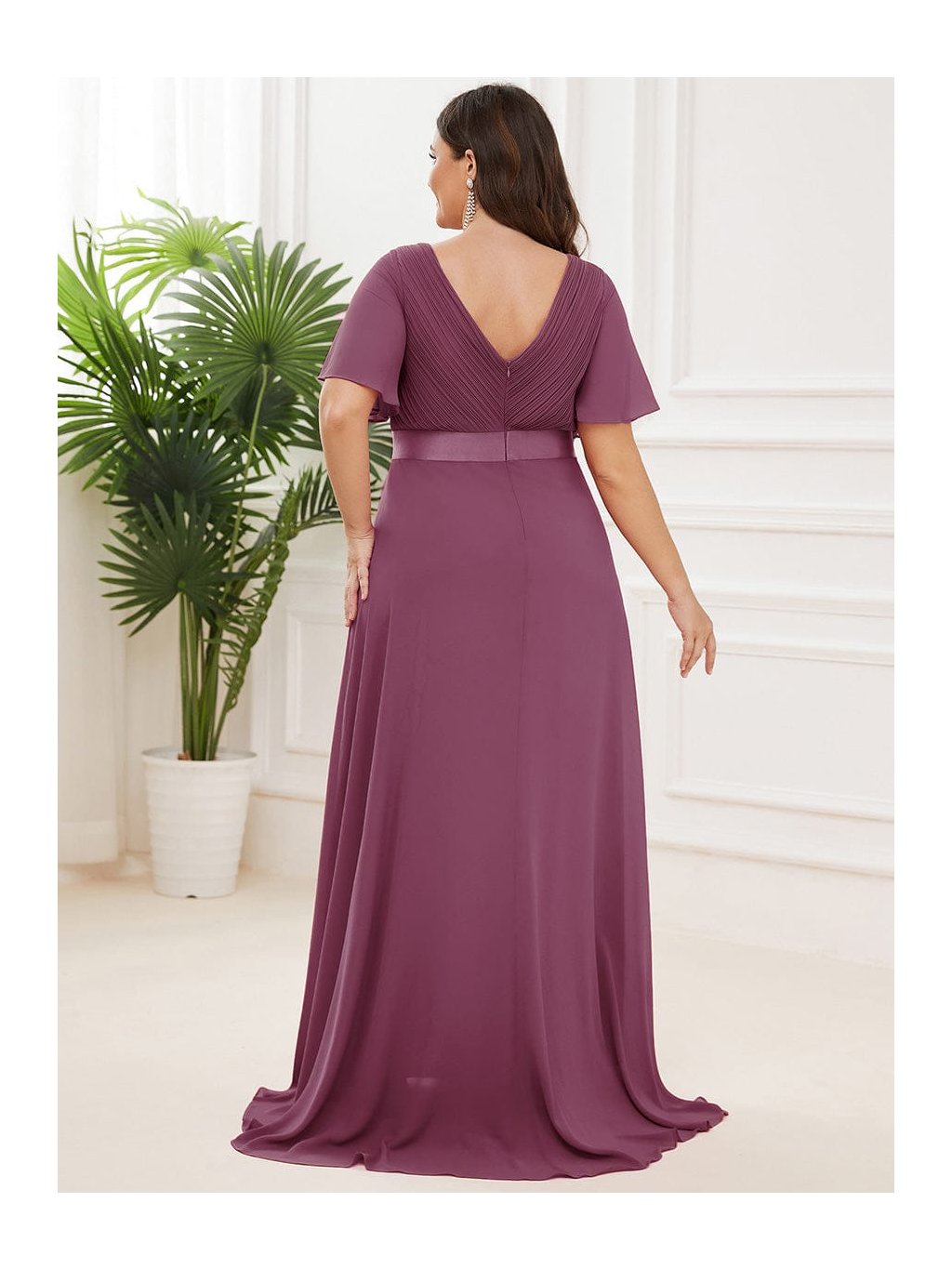 Hluboký tlumený odstín švestky působí výrazně, přesto velmi ženským dojmem. Tyto dlouhé šaty zaujmou na první pohled propracovaným plisovaným živůtkem s překládaným výstřihem do V, který krásně zvýrazní dekolt. Hladký pasový lem podtrhne siluetu a dlouhá splývavá sukně se při chůzi elegantně rozvine. Krátké volánové rukávy přinášejí lehkost a příjemný komfort. Model je ideální na svatbu i slavnostní večer, kdy chcete působit sebevědomě a nepřehlédnutelně.