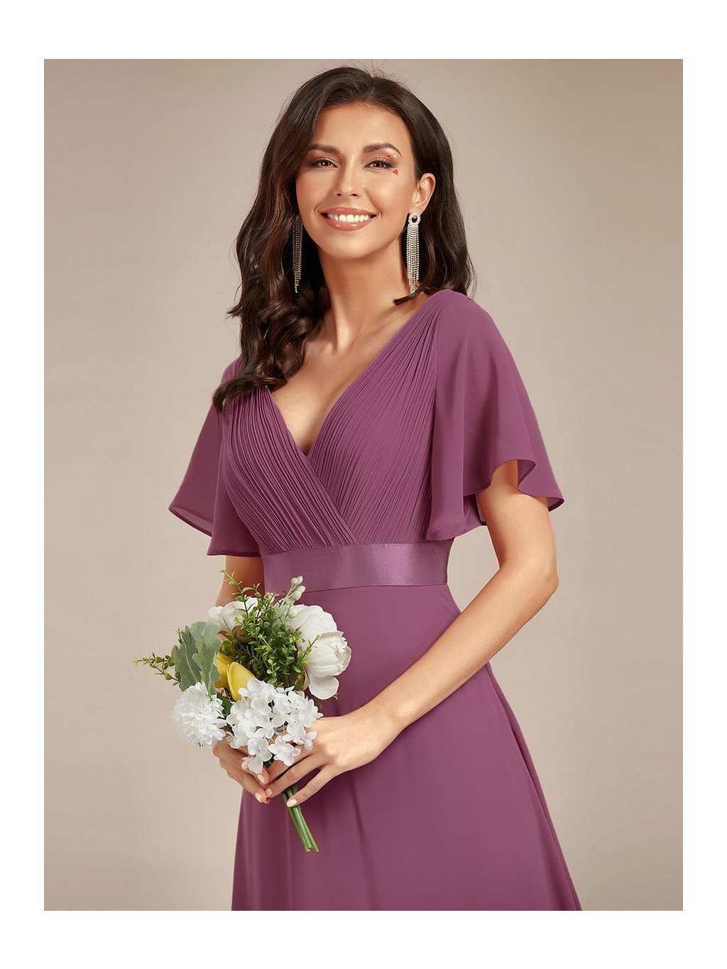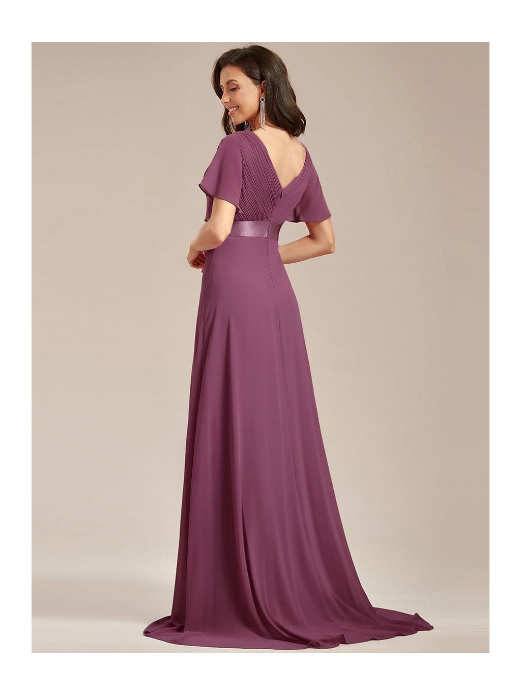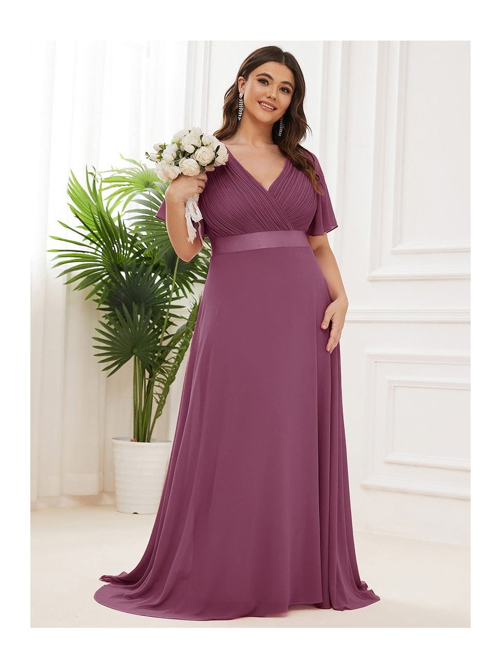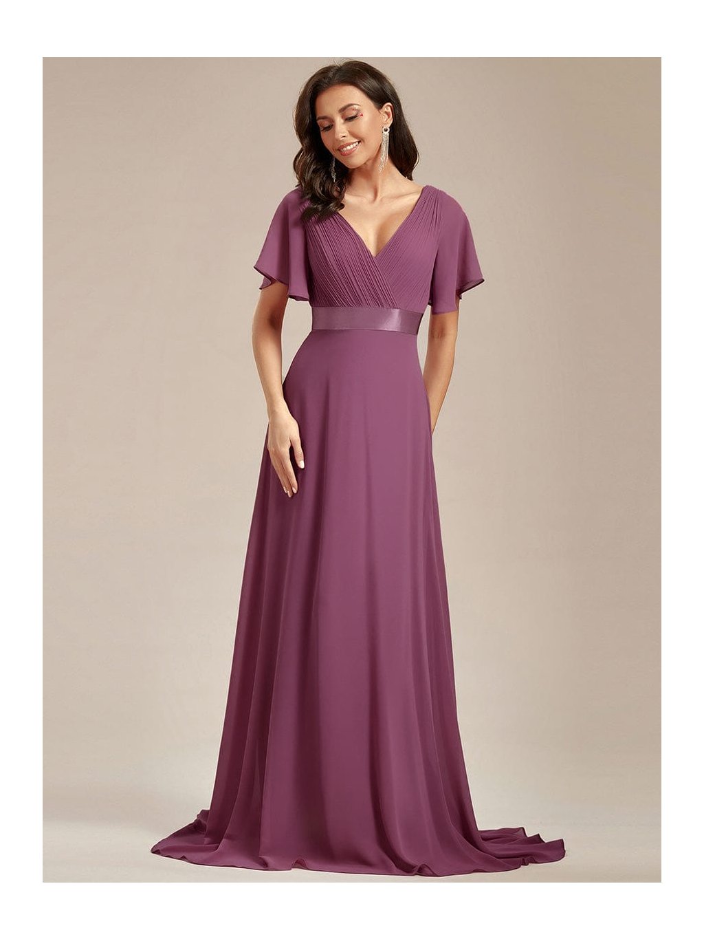 Hluboký tlumený odstín švestky působí výrazně, přesto velmi ženským dojmem. Tyto dlouhé šaty zaujmou na první pohled propracovaným plisovaným živůtkem s překládaným výstřihem do V, který krásně zvýrazní dekolt. Hladký pasový lem podtrhne siluetu a dlouhá splývavá sukně se při chůzi elegantně rozvine. Krátké volánové rukávy přinášejí lehkost a příjemný komfort. Model je ideální na svatbu i slavnostní večer, kdy chcete působit sebevědomě a nepřehlédnutelně.