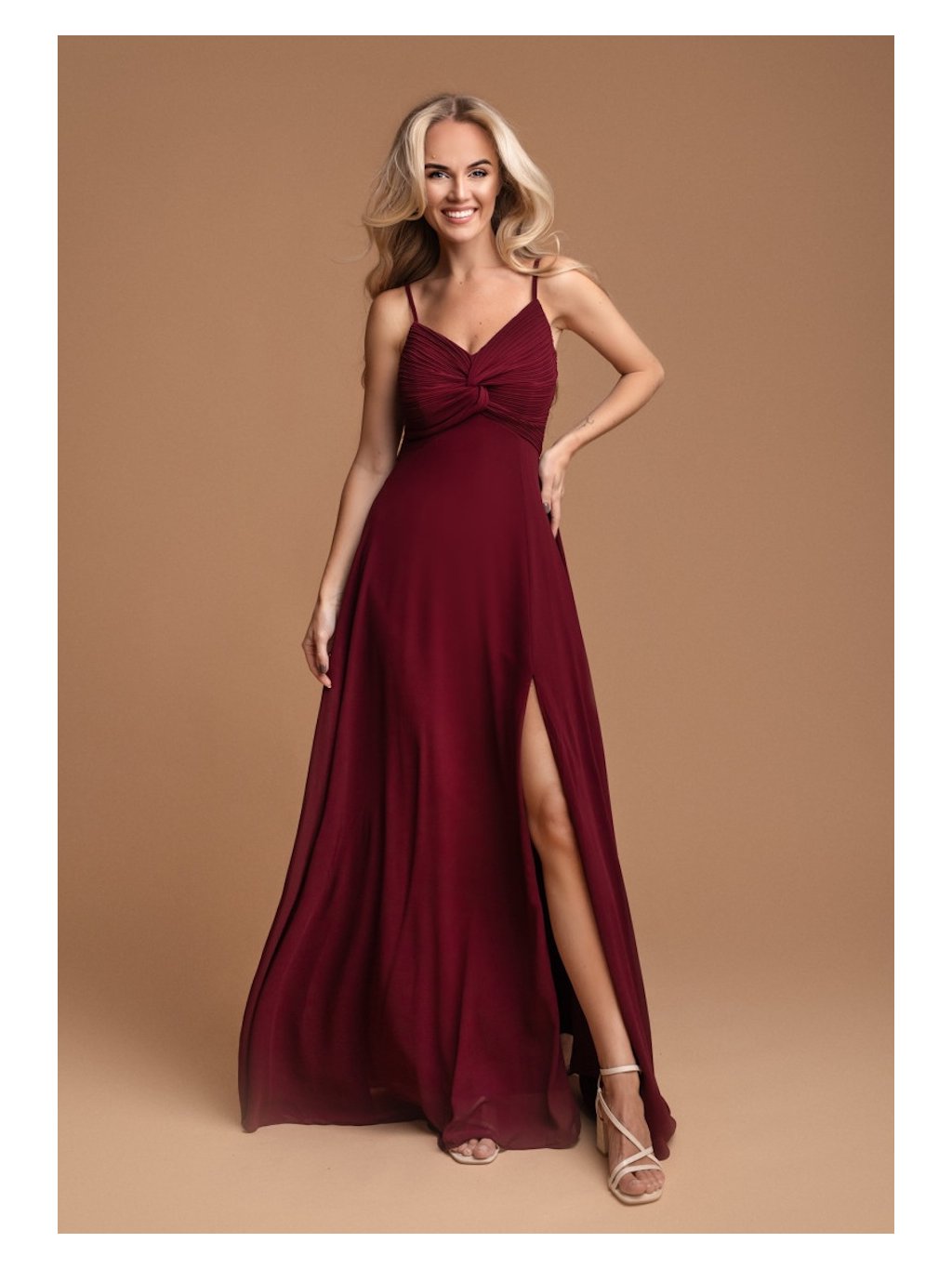 Vínové šaty s lehce dramatickým nádechem zaujmou už svým odstínem, který krásně funguje při denním světle, ale i v záři reflektorů. Řasený živůtek s uzlem v přední části vytváří zajímavý detail a přirozeně směřuje pozornost k horní linii šatů. Tenká ramínka dodávají celku lehkost a nechávají vyniknout ramenům i krku. Dlouhá sukně se při pohybu jemně vlní a vysoký rozparek přidává modelu špetku odvahy, aniž by působil přehnaně. Skvělá volba pro družičky i svatební hosty.