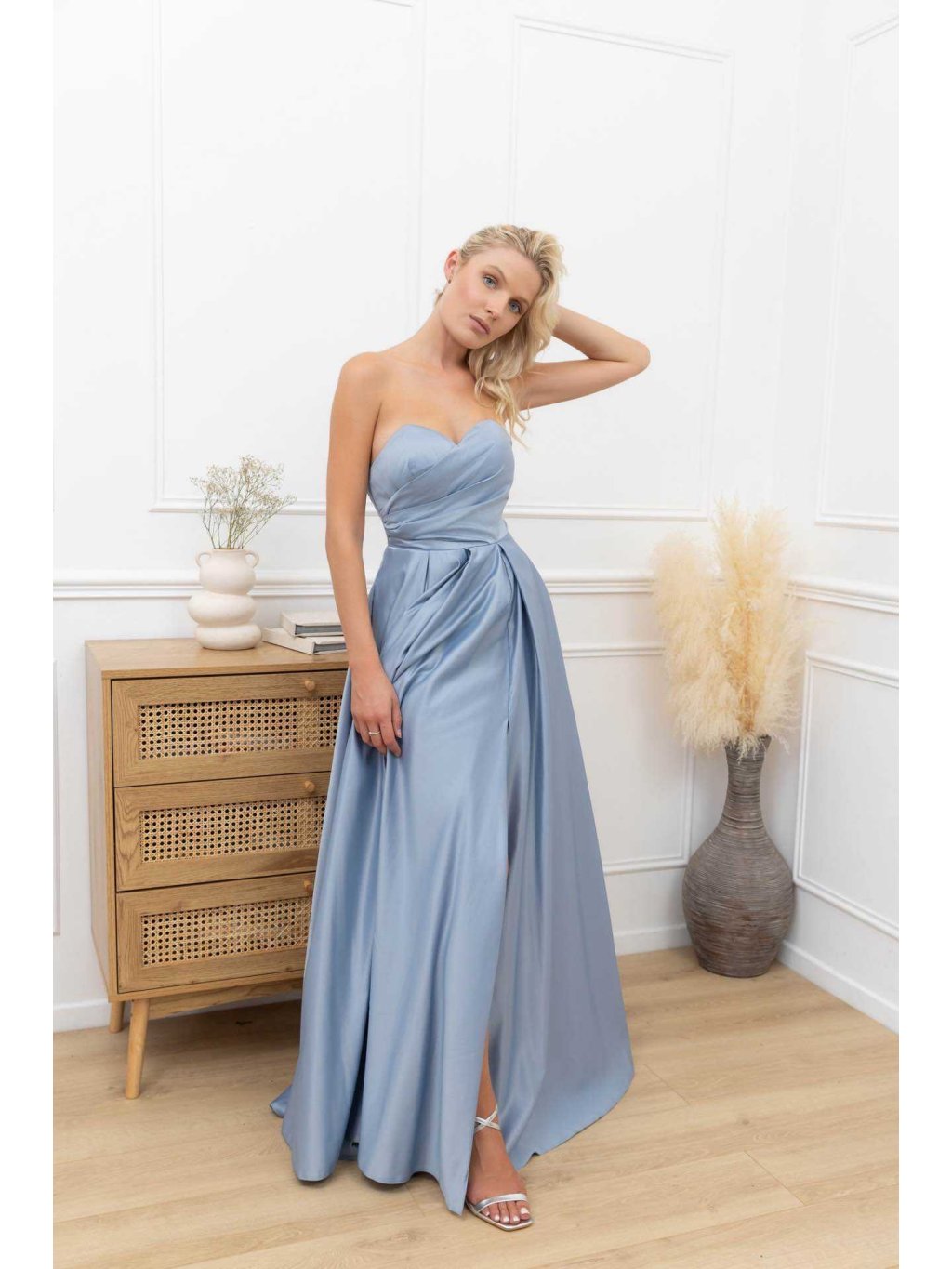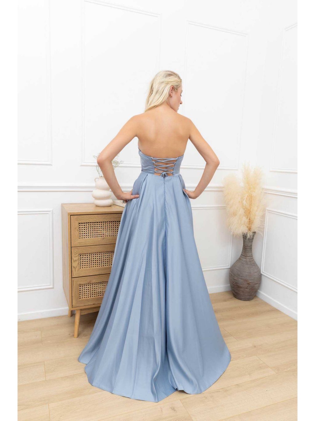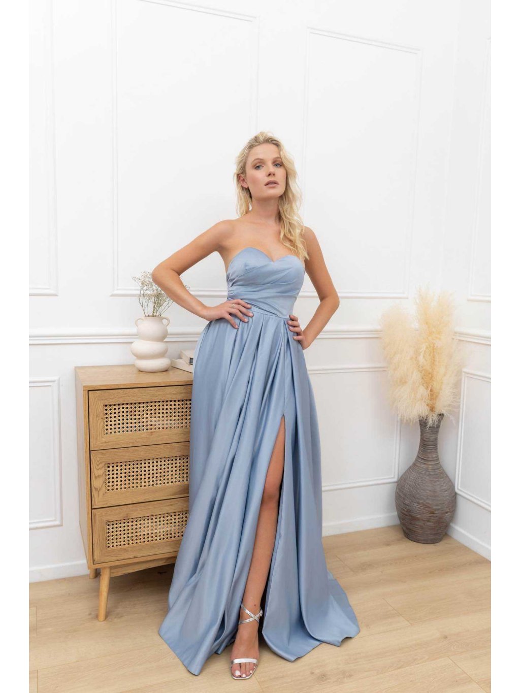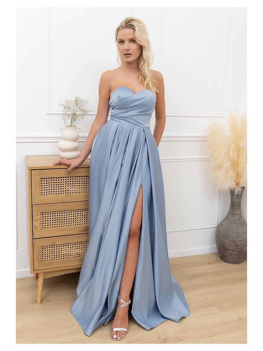 Tyto modré saténové šaty bez ramínek Vás zaujmou kombinací lehkosti a elegance. Jsou ideální volbou pro všechny slavnostní události - ať už se budete bavit na večírku nebo tančit na plesu. Srdcový výstřih zvýrazní dekolt, šněrování na zádech zajistí, že šaty dokonale padnou, a rozparek vpředu dodá outfitu jemný pohyb i přirozenou lehkost.