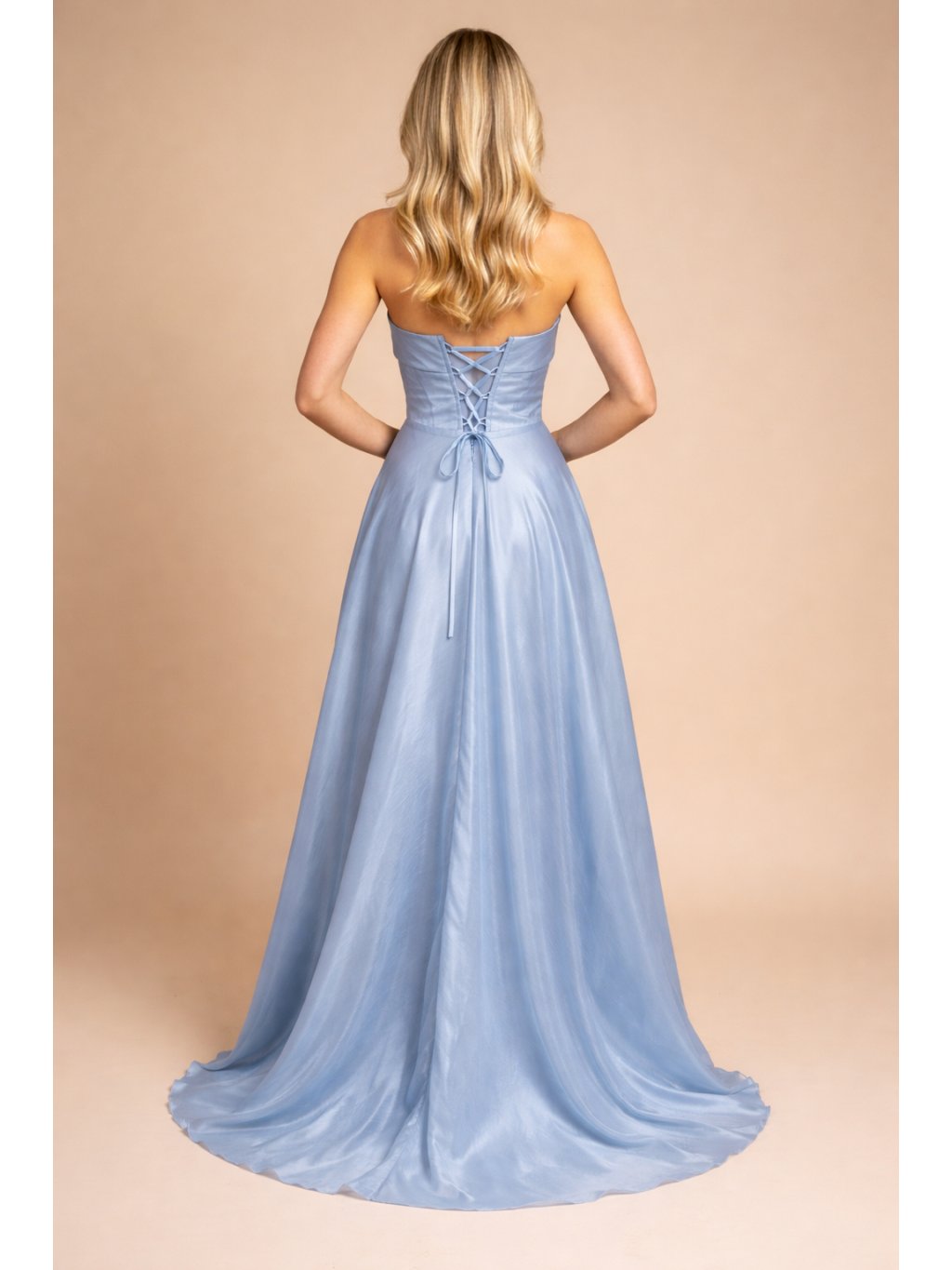 Elegantní model ve světle modré barvě působí velmi čistě a romanticky. Korzetový živůtek bez ramínek krásně zvýrazňuje ramena, dekolt i linii pasu a vytváří vyváženou ženskou siluetu. Zadní šněrování umožňuje přizpůsobení postavě a zároveň funguje jako decentní detail na zádech. S těmito šaty určitě nesáhnete vedle, pokud se chystáte na maturitní nebo absolventský ples, případně večerní gala.