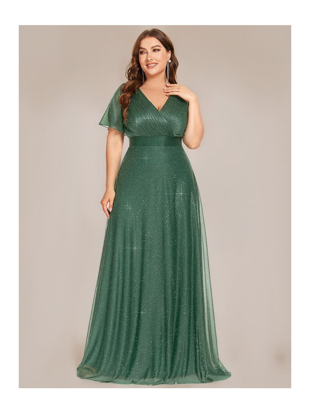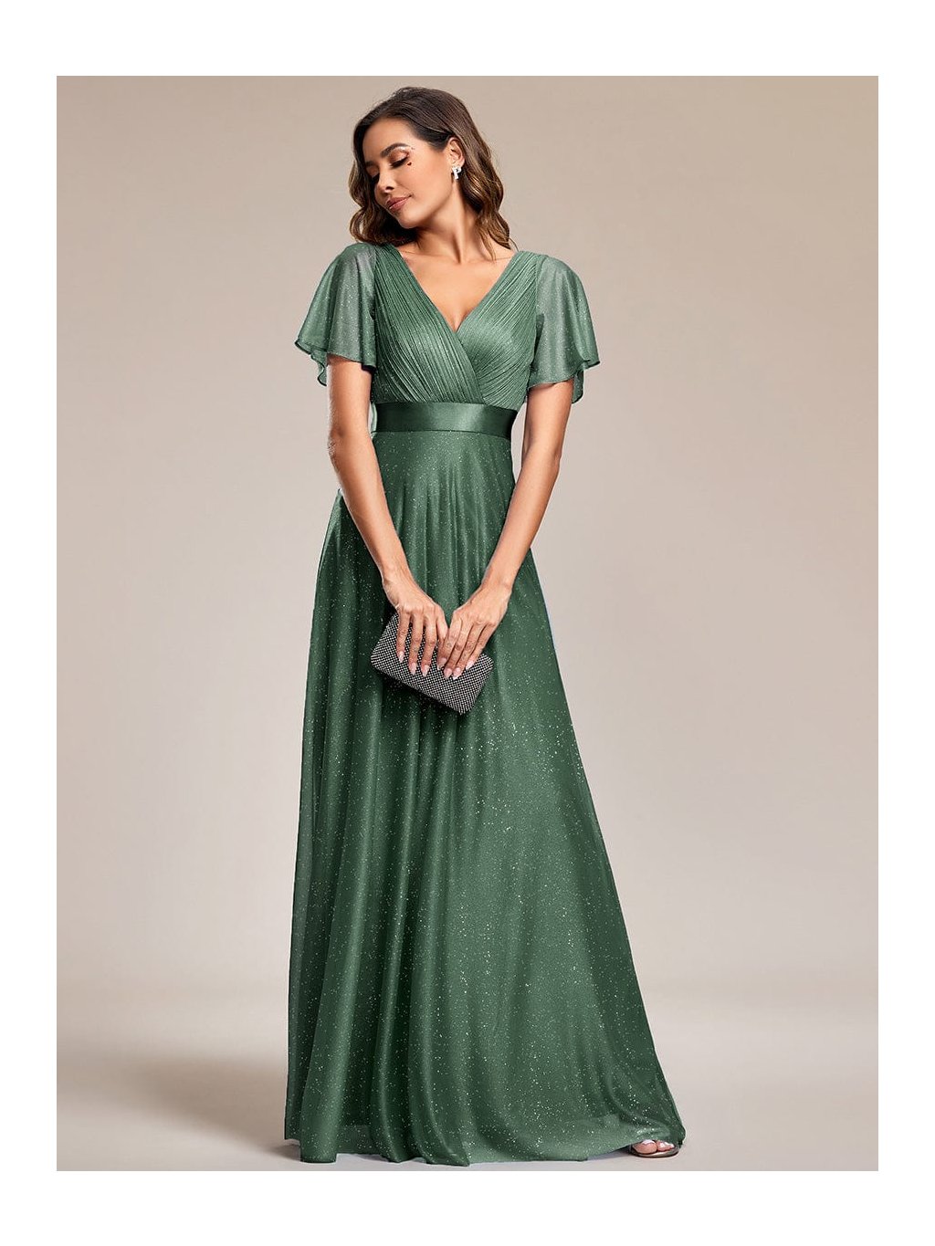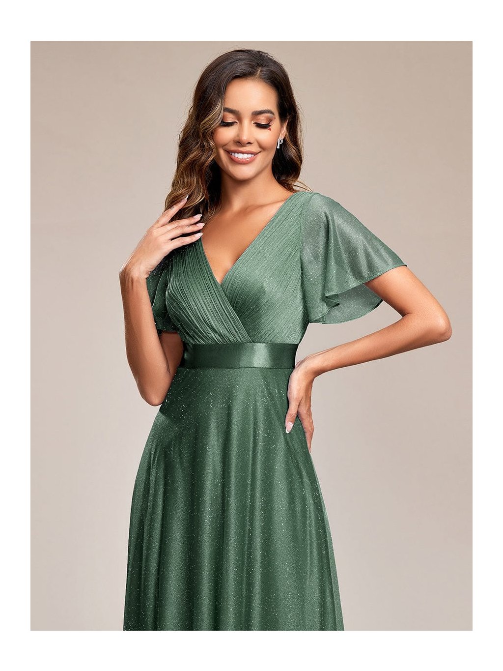 Tyto dlouhé zelené šaty s decentním třpytem jsou jako stvořené pro večerní události, kde chcete působit nepřehlédnutelně, a přesto elegantně. Výstřih do V vpředu i vzadu opticky prodlouží postavu a jemné volánkové rukávy dodají šatům lehkost a příjemně zakryjí paže. Vyšší pas krásně formuje ženské křivky a splývavá sukně při chůzi působí velmi efektivně. Skvělá volba na galavečery, nebo na plesy.