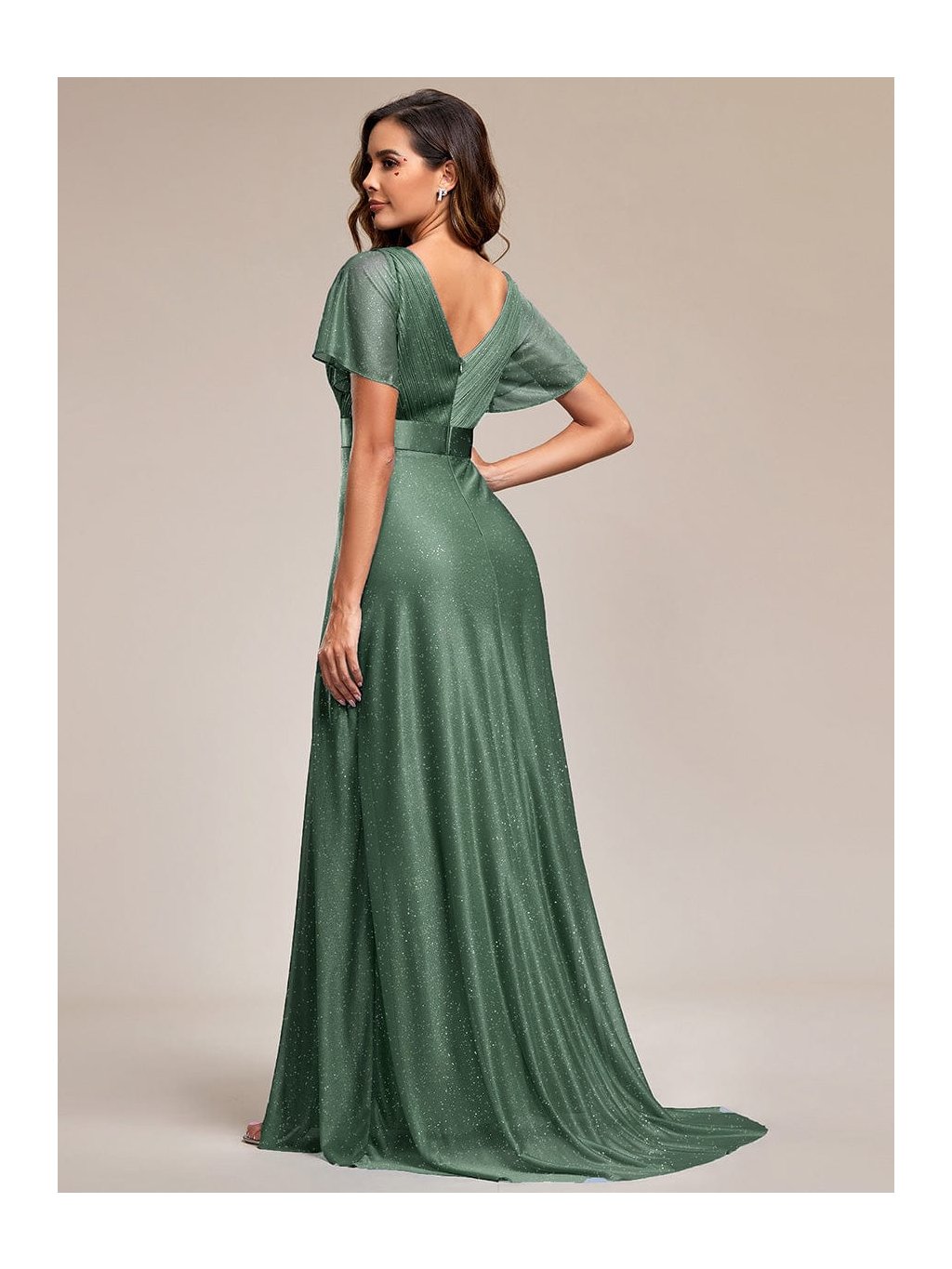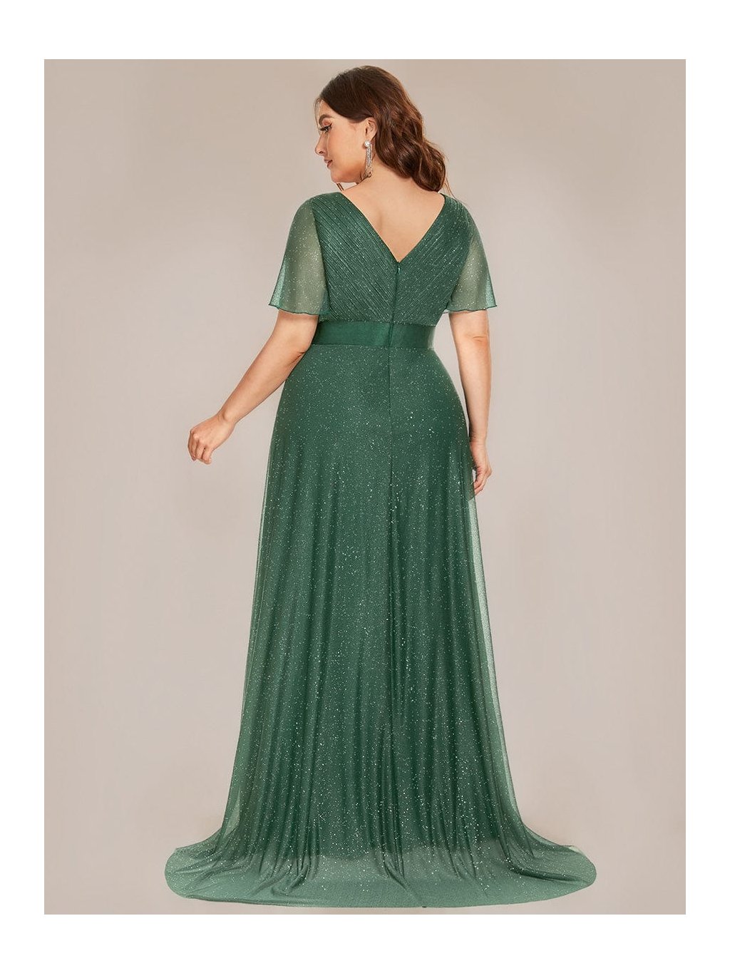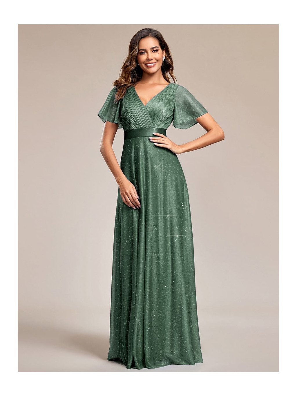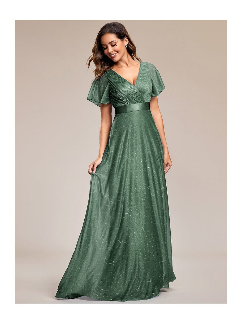Tyto dlouhé zelené šaty s decentním třpytem jsou jako stvořené pro večerní události, kde chcete působit nepřehlédnutelně, a přesto elegantně. Výstřih do V vpředu i vzadu opticky prodlouží postavu a jemné volánkové rukávy dodají šatům lehkost a příjemně zakryjí paže. Vyšší pas krásně formuje ženské křivky a splývavá sukně při chůzi působí velmi efektivně. Skvělá volba na galavečery, nebo na plesy.