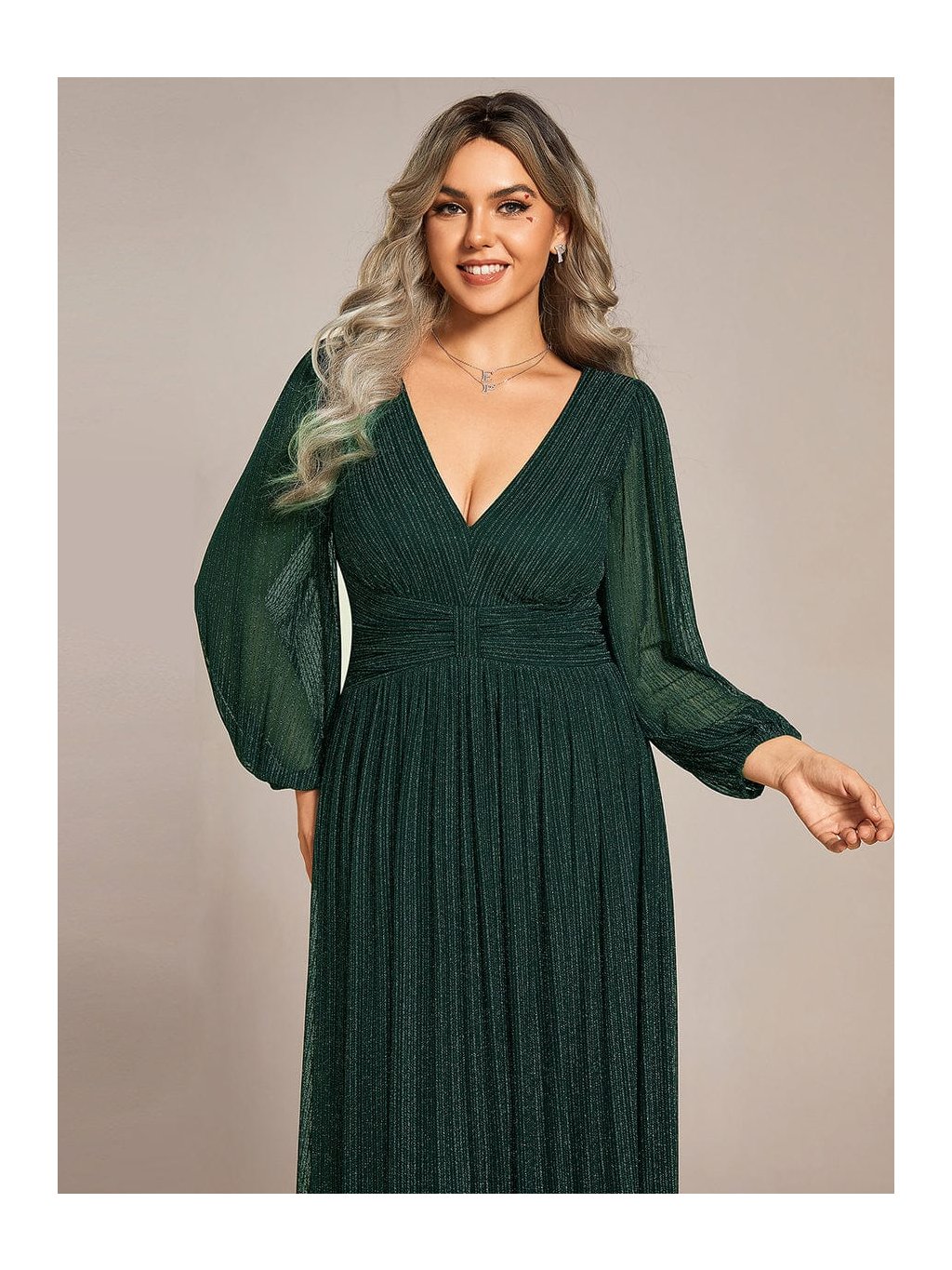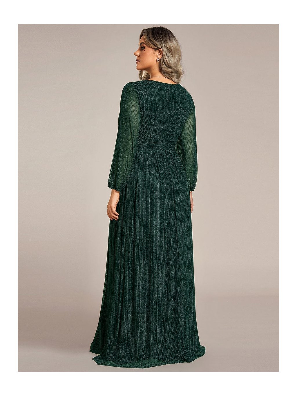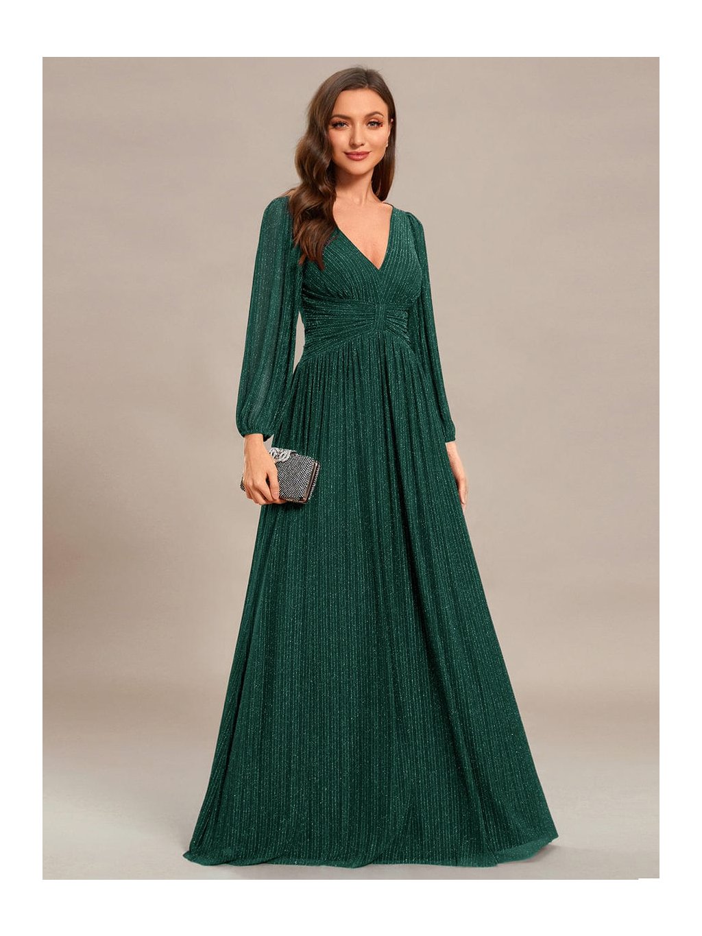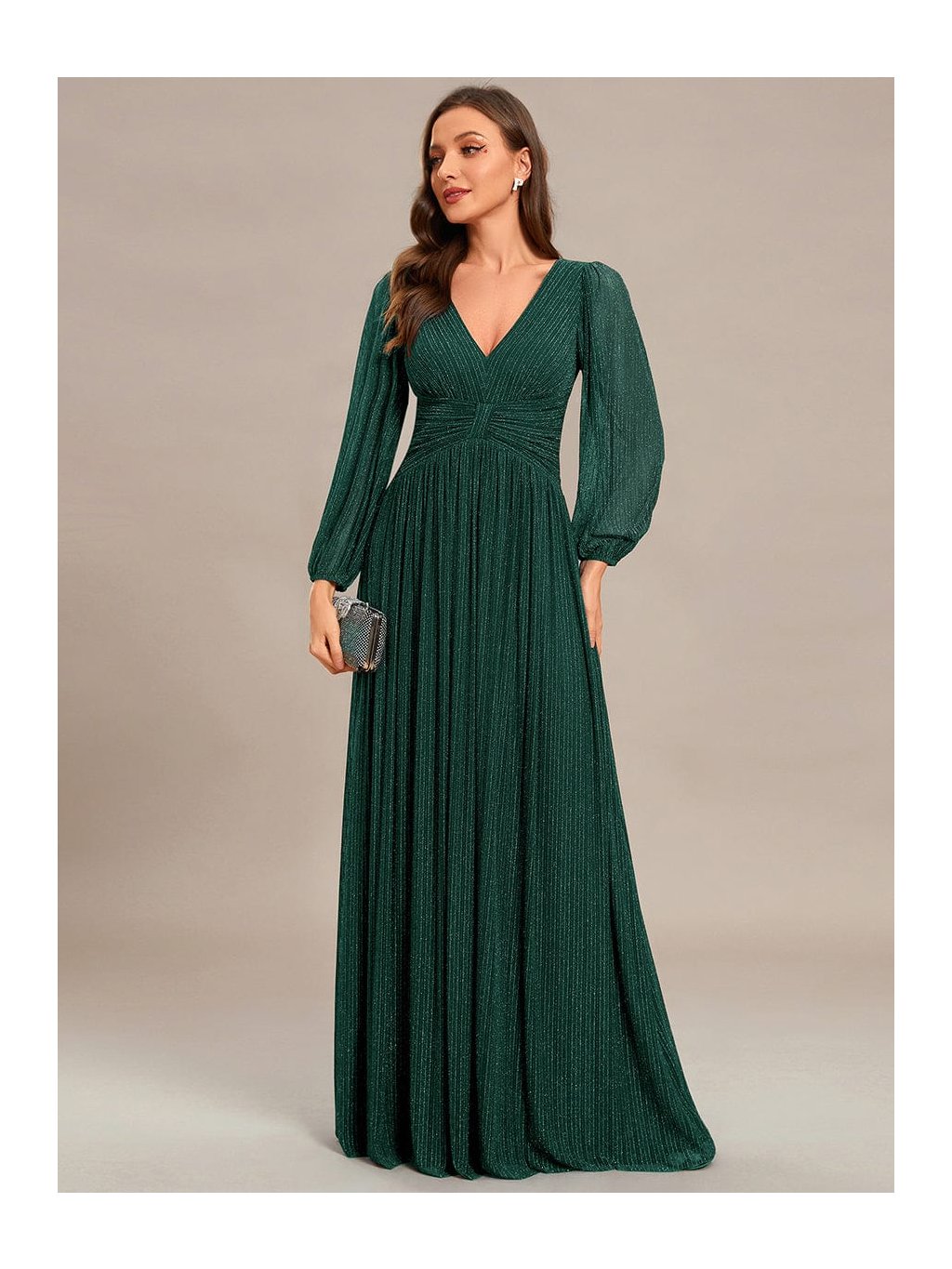 Elegantní lahvově zelené šaty se stříbrnými nitkami zdobícími šaty po celé délce včetně rukávů Vám budou slušet na všech večerních společenských událostech, předávání cen či plesech. Šaty jsou navrženy přesně tak, abyste mohla zakrýt paže nebo nohy, zároveň ale aby vynikl dekolt a byl opticky zúžen pas díky nabírané látce pod prsy.