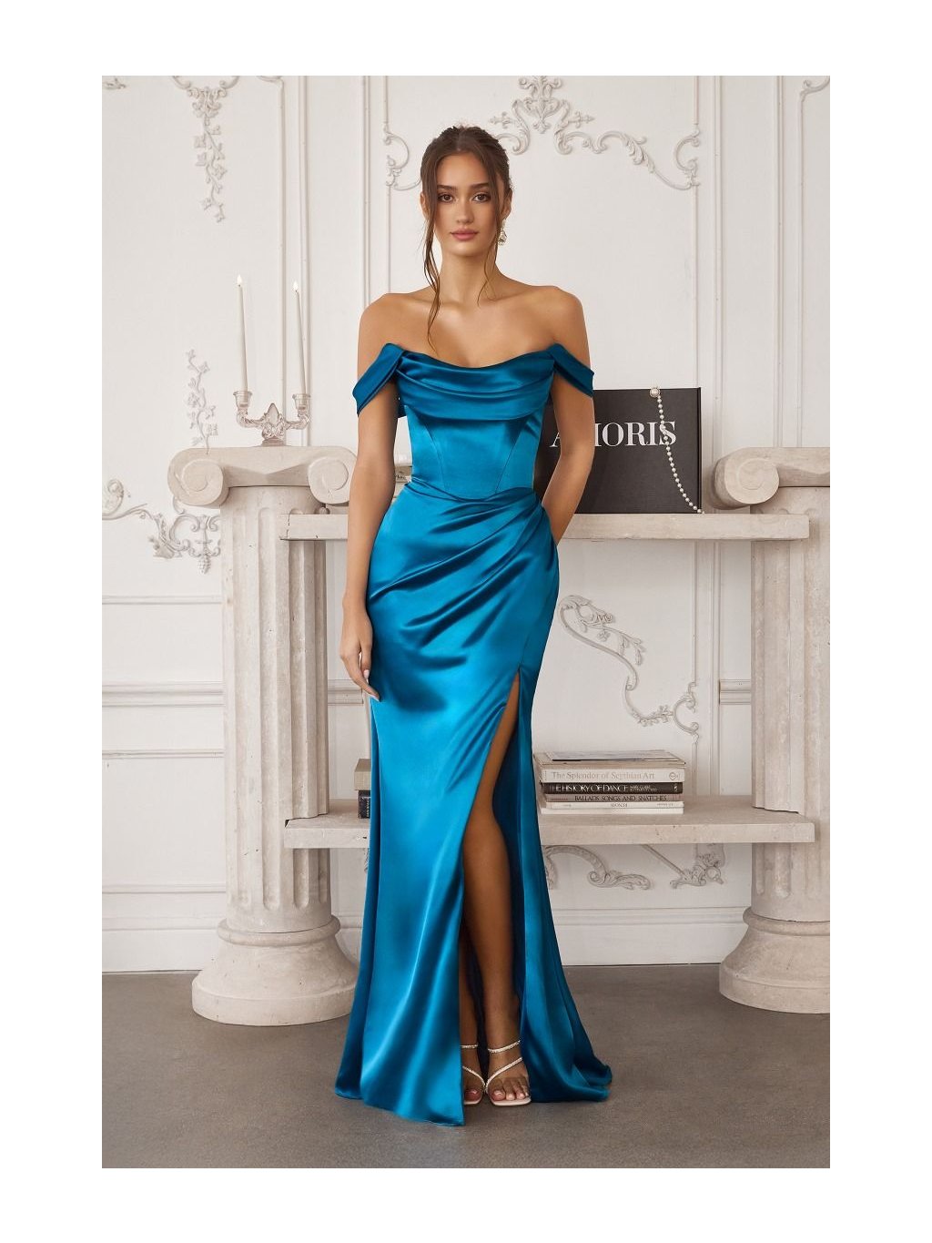 Tyto petrolejové saténové společenské šaty působí mimořádně elegantně a sofistikovaně. Hladký lesklý materiál krásně odráží světlo a dodává modelu luxusní nádech. Korzetový živůtek je jemně tvarovaný a zdobený decentním řasením, které zvýrazňuje pas a ženské křivky. Spadlá ramínka vytvářejí romantický nádech, zatímco dlouhá splývavá sukně s výrazným rozparkem dodává šatům smyslnost a lehkost pohybu. Tento model je ideální volbou na plesy, svatby i další výjimečné společenské události, kde chcete působit elegantně a sebevědomě.
