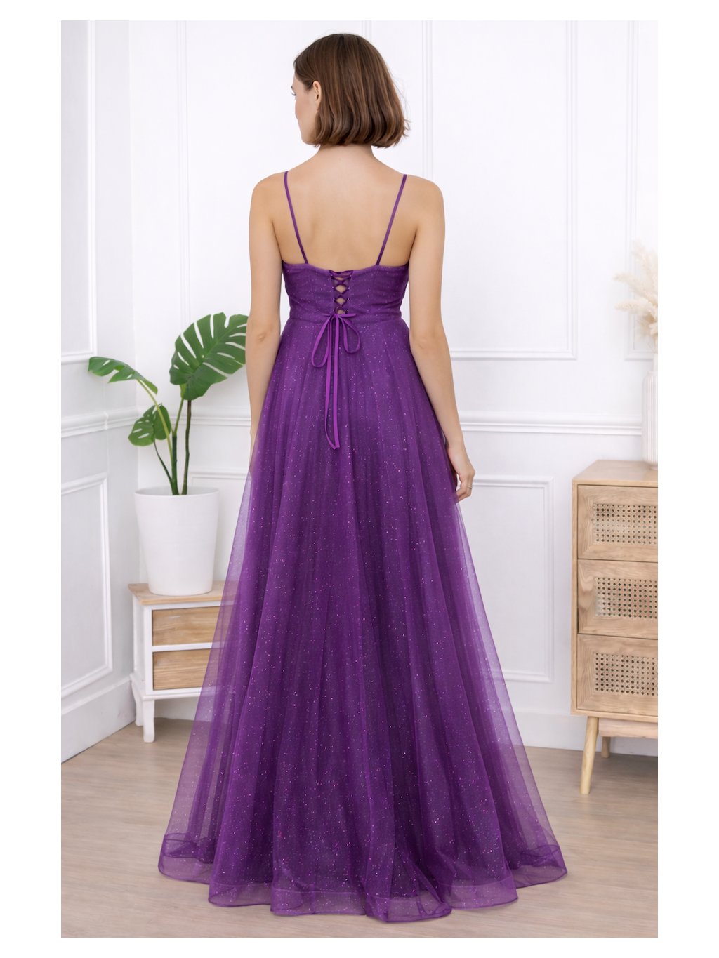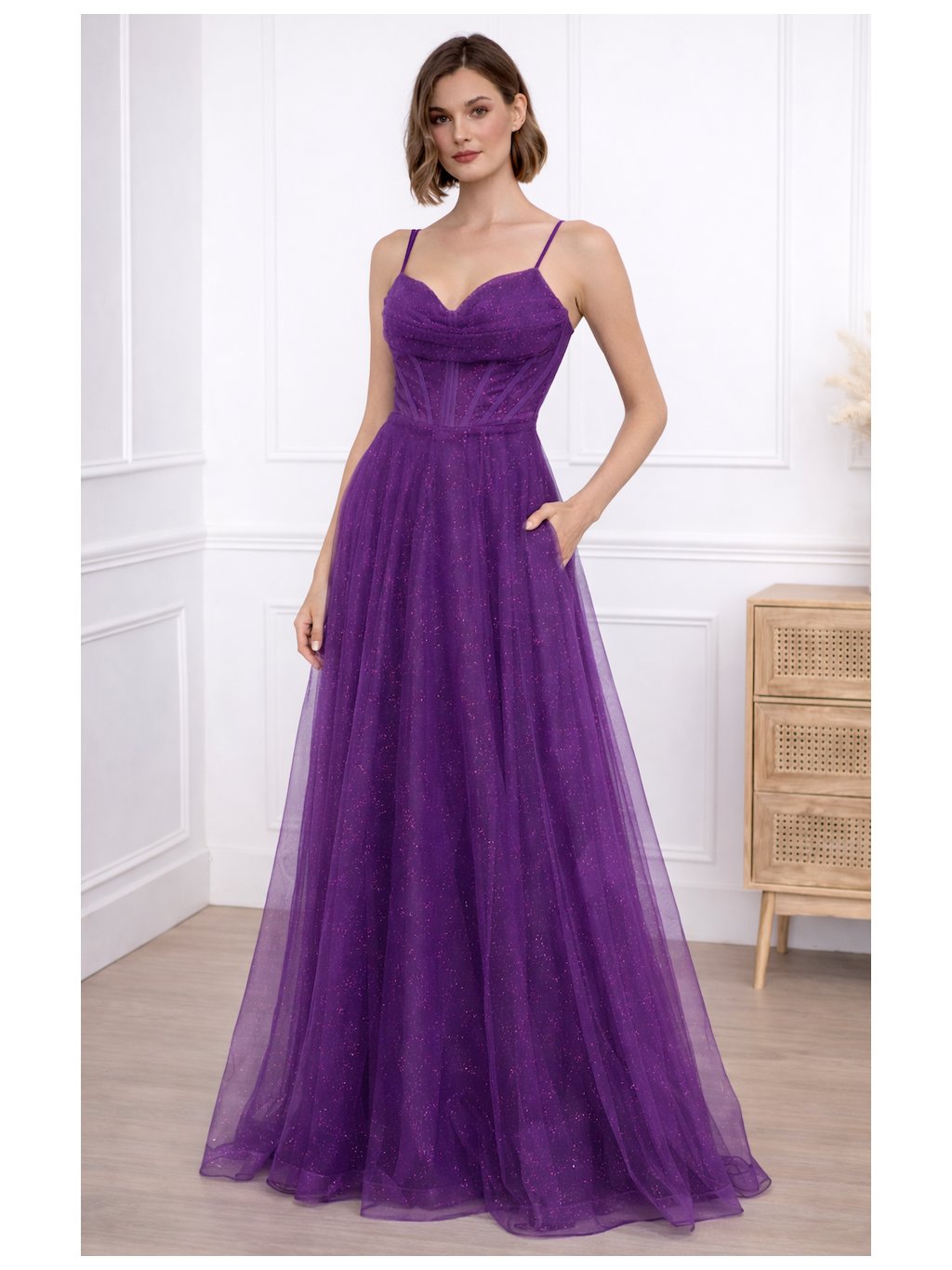 Elegantní fialové šaty z jemného tylu zaujmou svou lehkostí a decentním třpytem, který dodává modelu slavnostní charakter bez přehnané okázalosti. Korzetový živůtek s kosticemi krásně formuje postavu a přirozeně zvýrazňuje pas. Měkce tvarovaný výstřih působí jemně a žensky. Úzká ramínka spolu se šněrováním na zádech umožňují pohodlné přizpůsobení a zároveň dodávají šatům zajímavý detail. Splývavá maxi sukně se při chůzi ladně pohybuje a vytváří elegantní siluetu vhodnou pro plesy, galavečery i výjimečné společenské události.