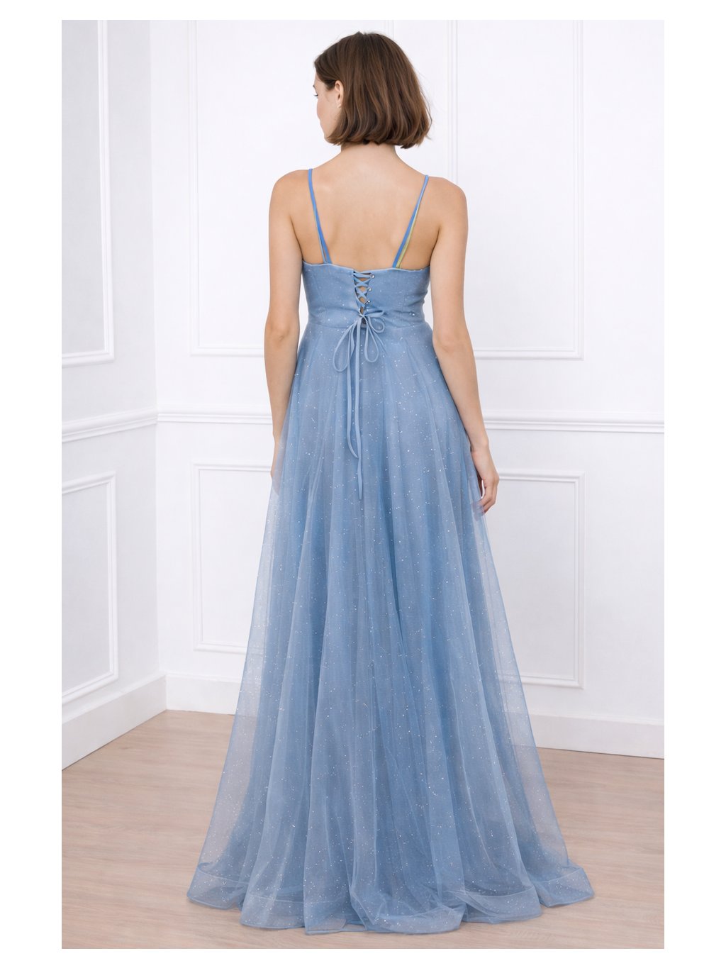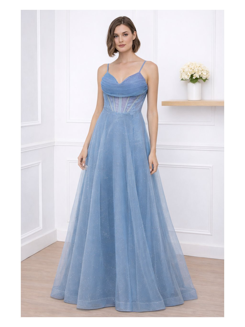 Tyto světle modré dlouhé šaty působí něžně, elegantně a žensky. Jemně třpytivý tyl dodává modelu slavnostní nádech, aniž by působil přehnaně výrazně. Řasený živůtek krásně zvýrazní dekolt a korzetový střih v oblasti pasu vytváří lichotivou siluetu. Dlouhá splývavá sukně se při chůzi pohybuje a dodává šatům vzdušnost a romantický charakter. Šaty jsou ideální volbou na plesy, svatby, večírky i jiné výjimečné události, kde chcete působit jemně a elegantně.