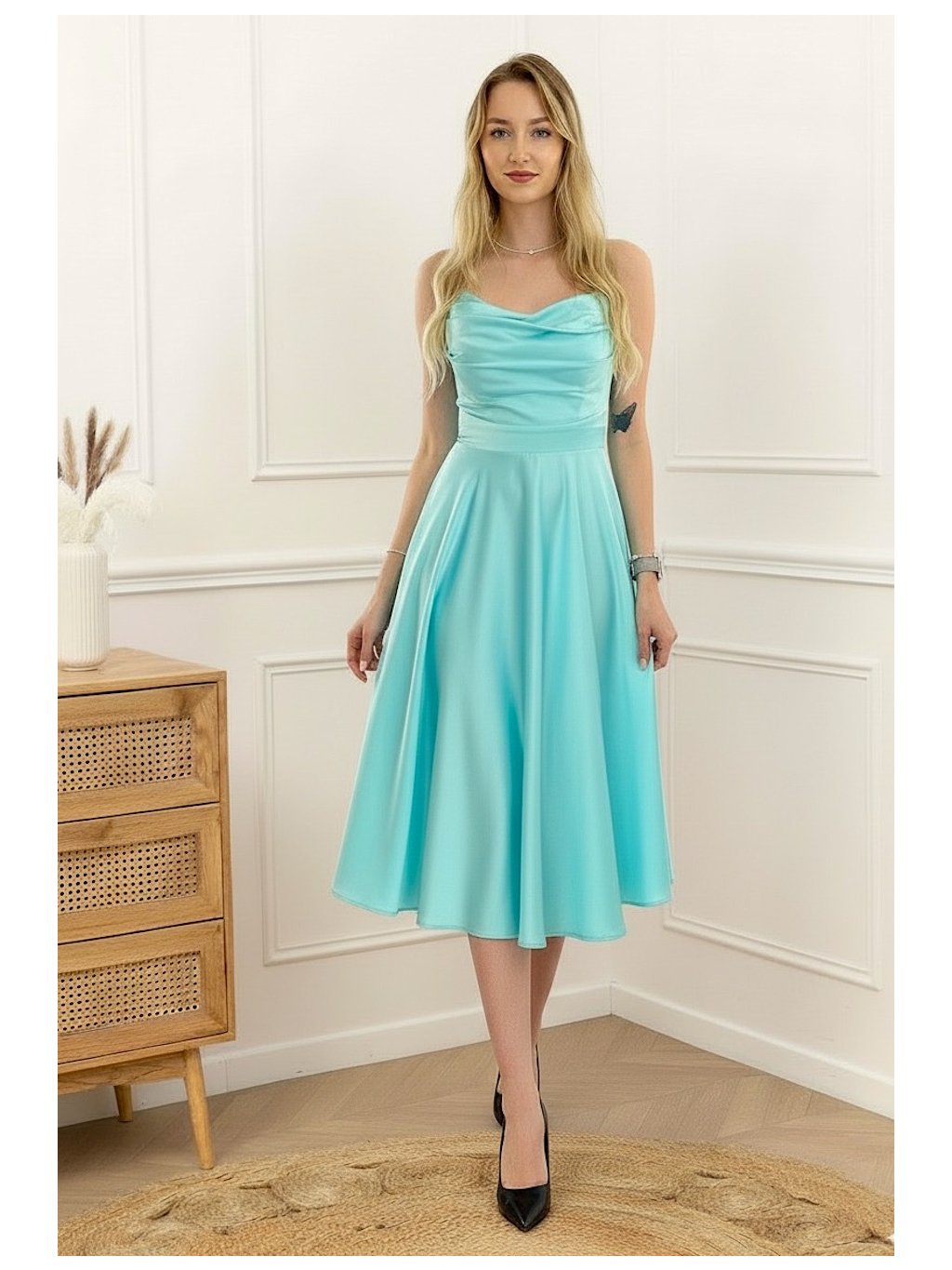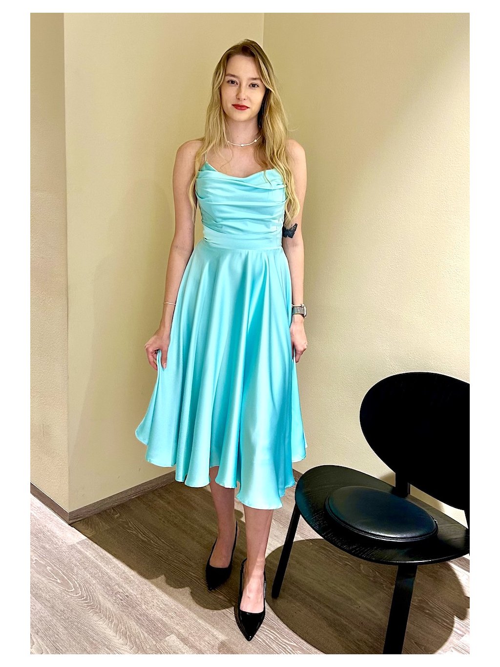 Vzdušné, jemně lesklé šaty v odstínu světlého tyrkysu působí lehce jako letní vánek. Hladký, splývavý materiál se při pohybu elegantně vlní a dodává modelu pocit volnosti. Horní díl je tvořen jemným nabíráním, které se lehce skládá přes dekolt a přechází v tenká ramínka, díky nimž šaty zůstávají subtilní a odhalená ramena působí velmi žensky. Celkový střih zvýrazňuje pas a nechává vyniknout přirozeným křivkám. Tyto šaty budou skvělou volbou nejen do tanečních, ale také pro družičky na svatbu či na ples.
