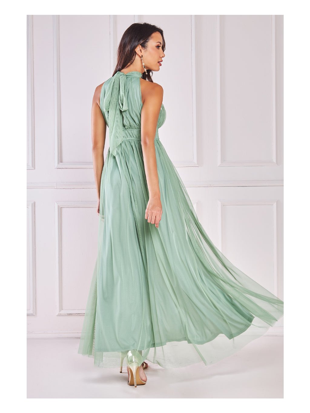 Dlouhé světle zelené společenské šaty z jemné vrstvy tylu vytváří vzdušný efekt, který se skvěle hodí na slavnostní události venku. Ať už jde o svatbu, letní ples nebo zahradní večírek, výběrem těchto šatů neuděláte chybu. Horní část je řešena halter výstřihem, který zvýrazňuje ramena a elegantně rámuje dekolt. Sukně je doplněna rozparkem, který při chůzi odhaluje nohu a dodává modelu lehce smyslný charakter.