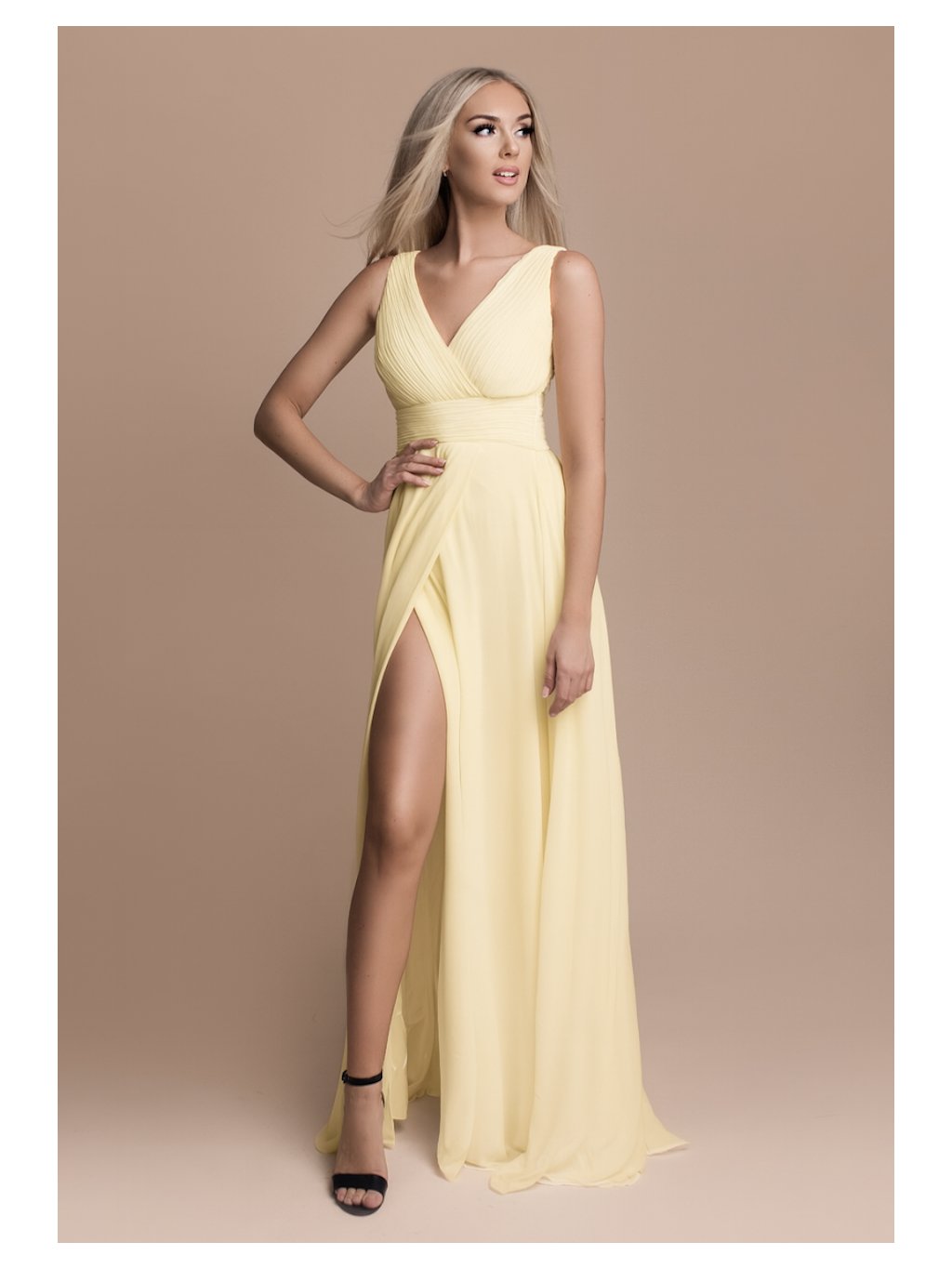 Tyto světle žluté šaty přinášejí svěží a zářivý vzhled, který působí lehce, moderně a velmi žensky. Jemně řasený živůtek s výstřihem do V přirozeně formuje horní linii a plynule navazuje na zvýrazněný pas, který vytváří elegantní proporce. Celý střih je navržen tak, aby silueta působila vzdušně a vyváženě. Lehký splývavý materiál reaguje na každý pohyb a vytváří jemný, plynulý efekt. Vysoký rozparek dodává modelu dynamiku a zároveň zachovává sofistikovaný charakter. Šaty působí výrazně díky své barvě, ale zároveň si zachovávají čistotu a eleganci bez zbytečných detailů. Ideální volba na svatby nebo oslavy.