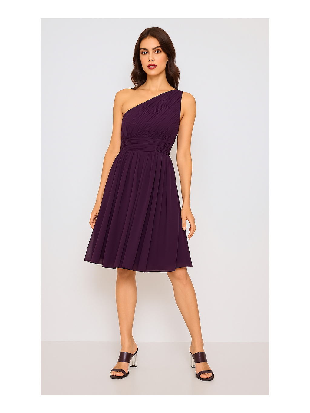 Tyto fialové šaty na jedno rameno Vás zaujmou čistou linií a ženským střihem. Plisovaný živůtek krásně přiléhá k postavě a zvýrazněný pas opticky prodlužuje siluetu. Lehká kolová sukně v délce nad kolena dodává modelu hravost a pohodlí při nošení. Šaty mají zezadu žabičkování, takže pohodlně obepnou postavu. Díky asymetrickému řešení dekoltu působí šaty originálně a elegantně, takže se hodí jak na svatby, tak i na taneční, oslavy nebo večírky.