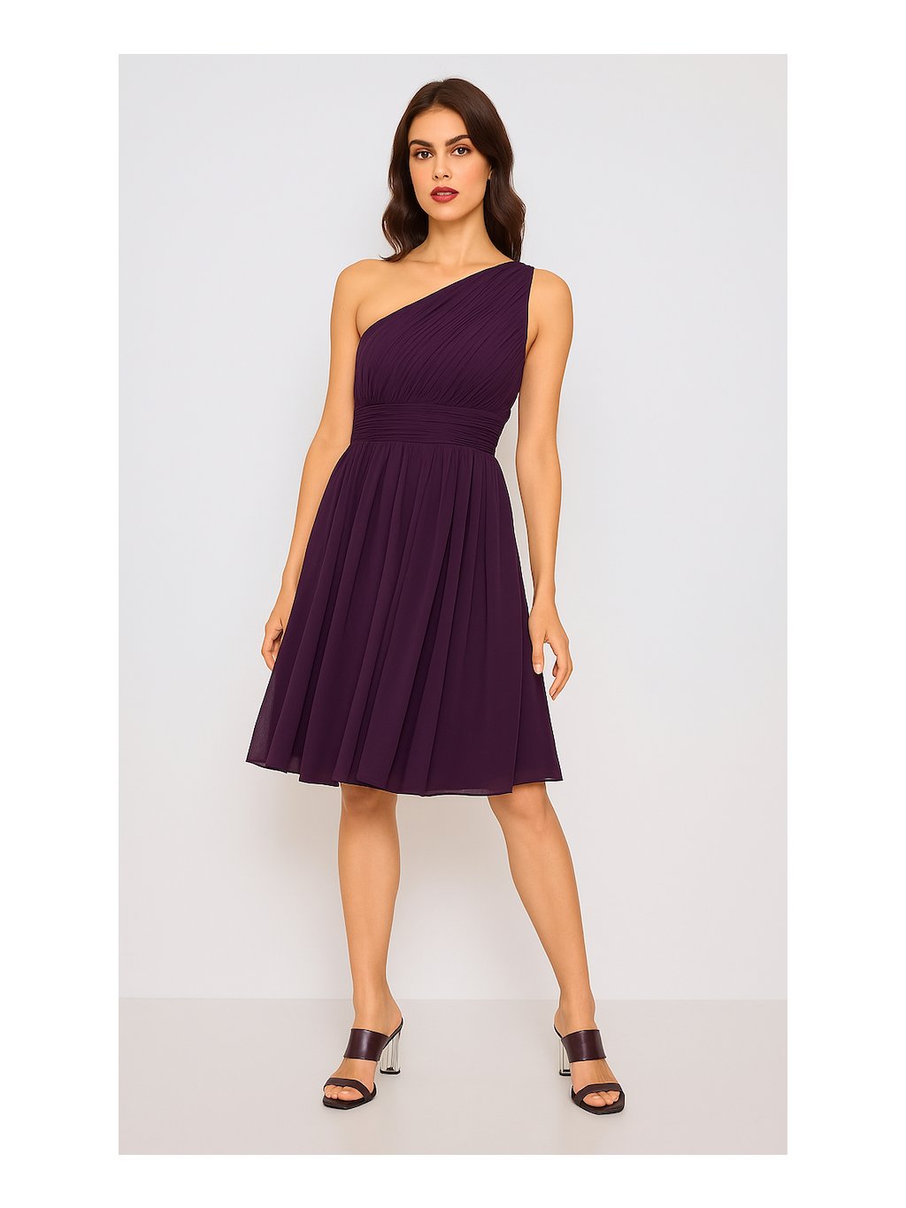Tyto fialové šaty na jedno rameno Vás zaujmou čistou linií a ženským střihem. Plisovaný živůtek krásně přiléhá k postavě a zvýrazněný pas opticky prodlužuje siluetu. Lehká kolová sukně v délce nad kolena dodává modelu hravost a pohodlí při nošení. Šaty mají zezadu žabičkování, takže pohodlně obepnou postavu. Díky asymetrickému řešení dekoltu působí šaty originálně a elegantně, takže se hodí jak na svatby, tak i na taneční, oslavy nebo večírky.
