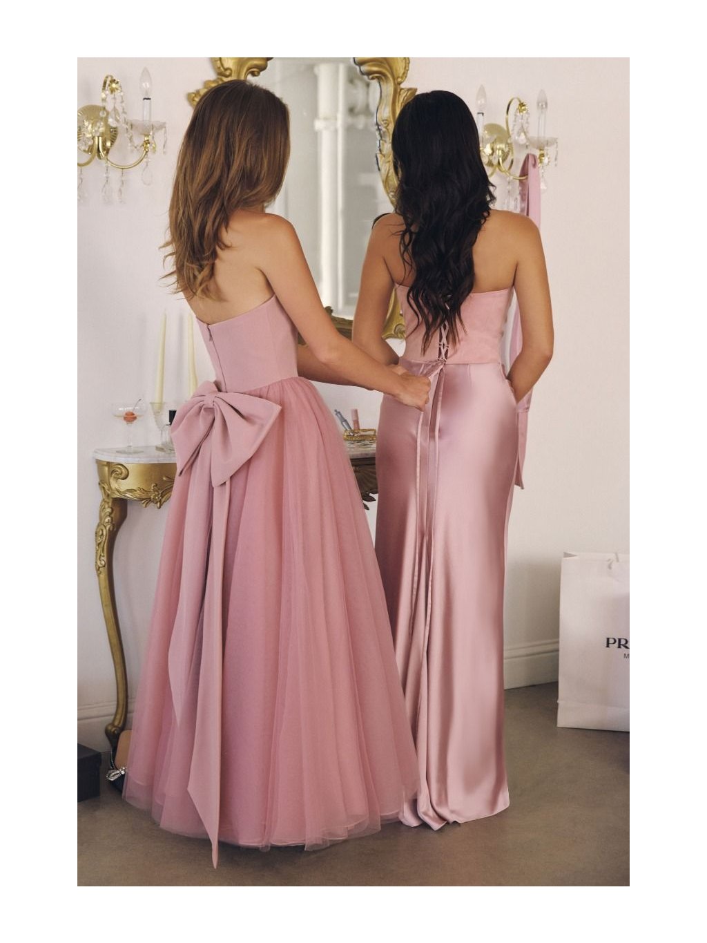 Tyto tylové šaty v jemném růžovém tónu působí jako scéna z filmového plesu. Vršek bez ramínek nechává vyniknout dekolt i ramena a vytváří krásně vyvážený kontrast k bohaté, nadýchané sukni. Tyl se při chůzi jemně vlní a dodává siluetě lehkost i pohyb, takže celý model působí živě a velmi ženským dojmem. Největší pozornost přitahuje velká mašle na zádech, která z těchto šatů dělá skutečný originál. Tyto šaty jsou perfektní volbou na společenské akce, slavnostní taneční večery, galavečery i oslavy.