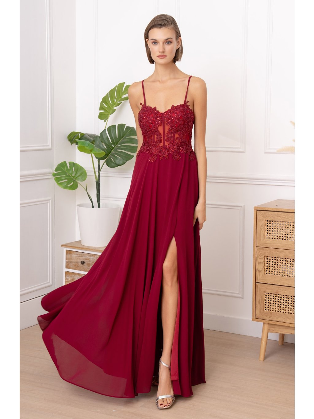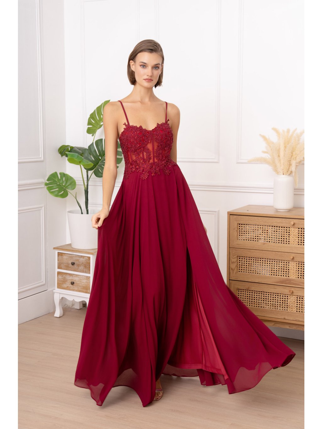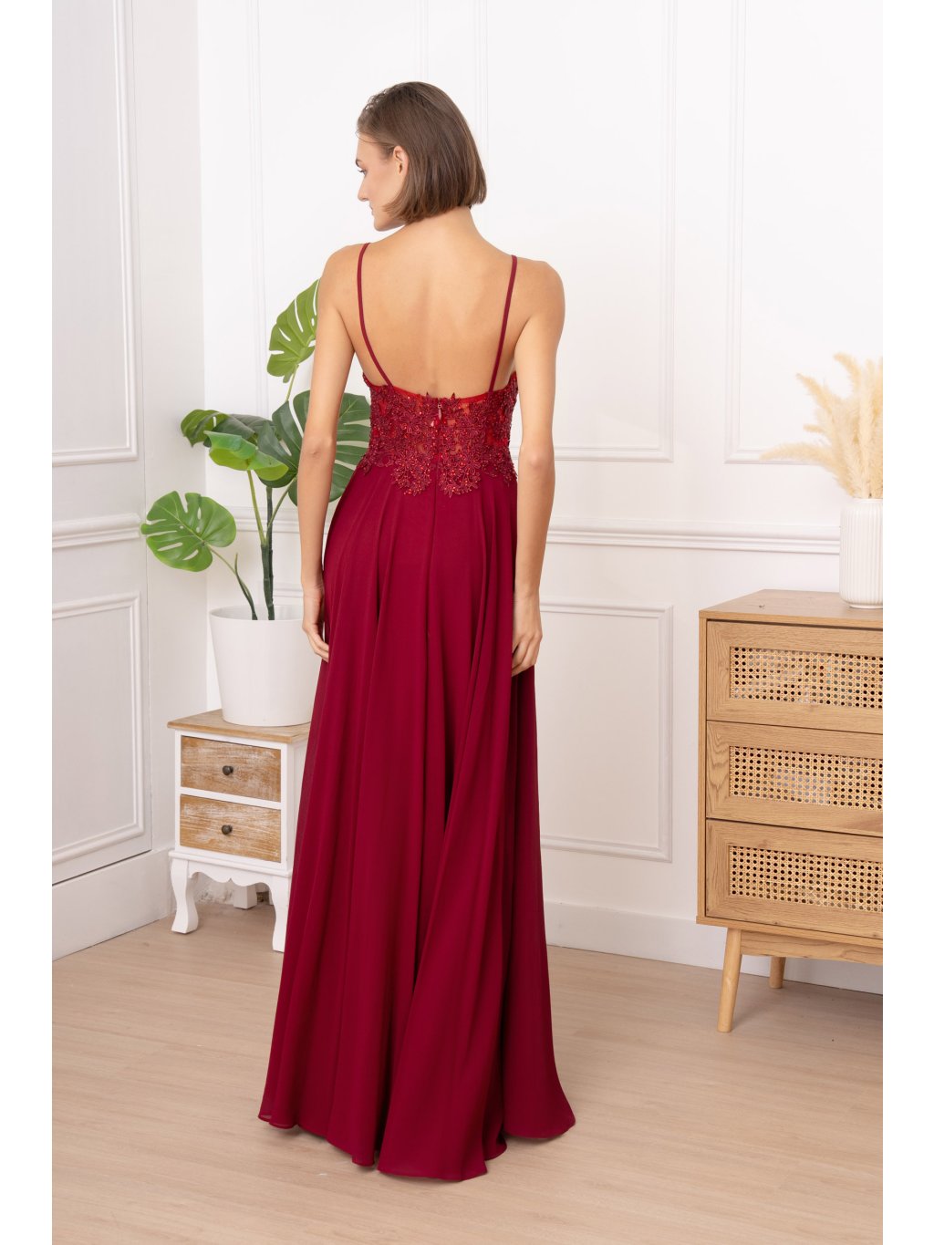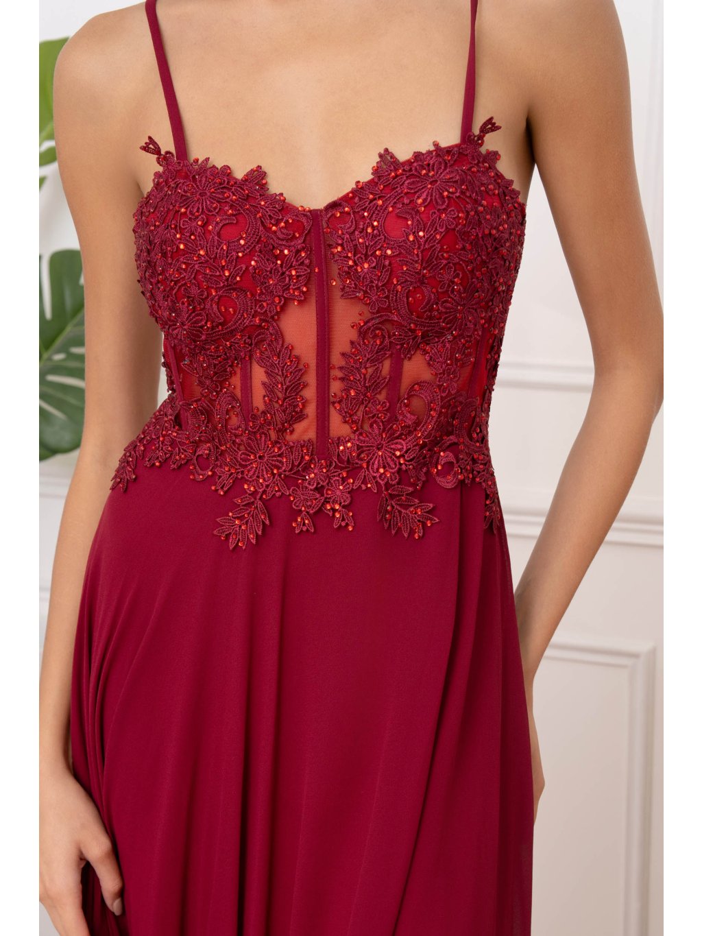 Krajkový horní díl s průhlednými vsadkami působí detailně a precizně. Výšivka ladí s vínovým odstínem látky, který je sytý, ale ne křiklavý. Sukně z jemného šifonu volně splývá a vytváří při pohybu lehký efekt. Otevřená záda doplňuje nenápadné zapínání na zip. Model je ideální na ples, večerní akci i svatební hostinu – elegantní, lehký a ženský v každém směru.