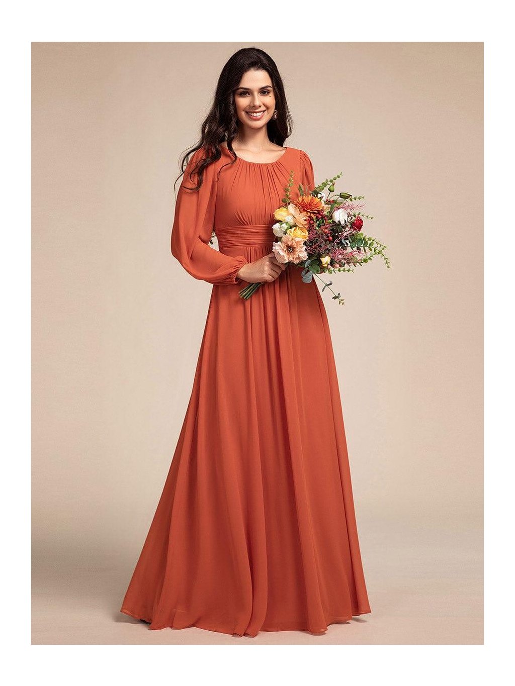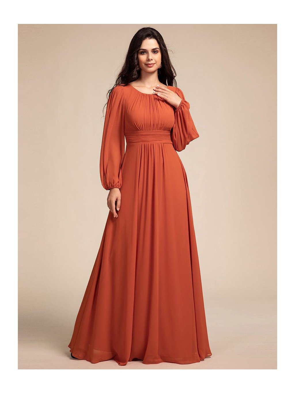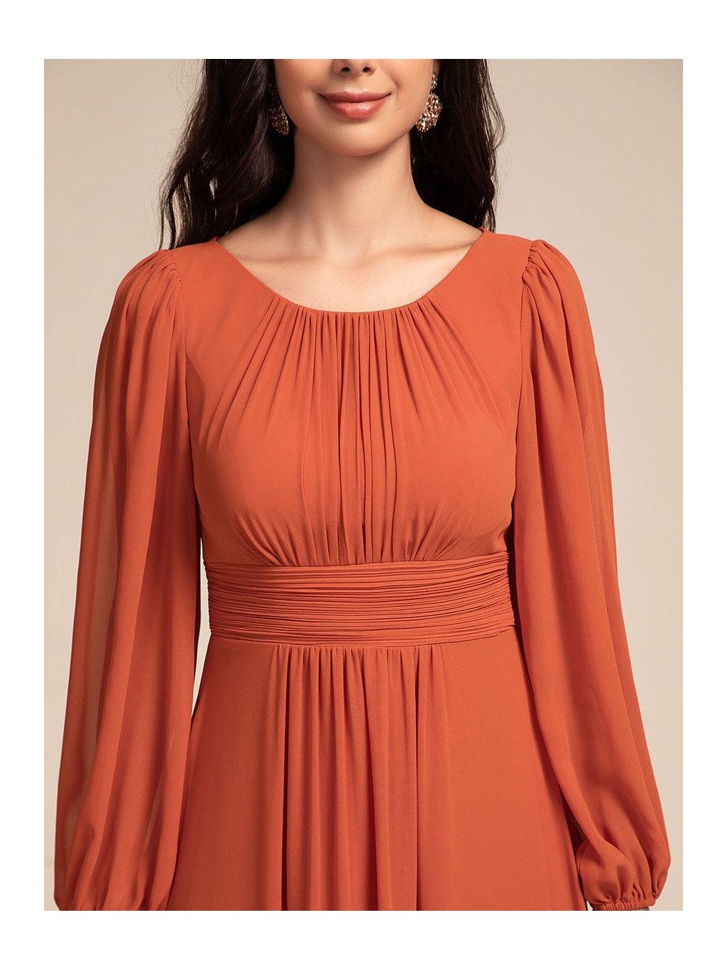 Barva zapadajícího slunce, lehkost pohybu a ženská silueta, která vynikne při každém kroku. Tyto dlouhé šaty v teplém oranžovém odstínu působí romanticky a přitom velmi přirozeně. Jemně řasený živůtek s kulatým výstřihem lichotí dekoltu, široce řasený pas krásně zvýrazní linii těla a splývavá sukně se ladně rozvíjí až k zemi. Dlouhé rukávy zakončené manžetou přinášejí jemnost i pohodlí během celého večera. Skvělá volba na jarní svatbu, ples, slavnostní večeři i focení při zlaté hodince – model, který si zamilujete pro jeho lehkost i výraznou barvu.