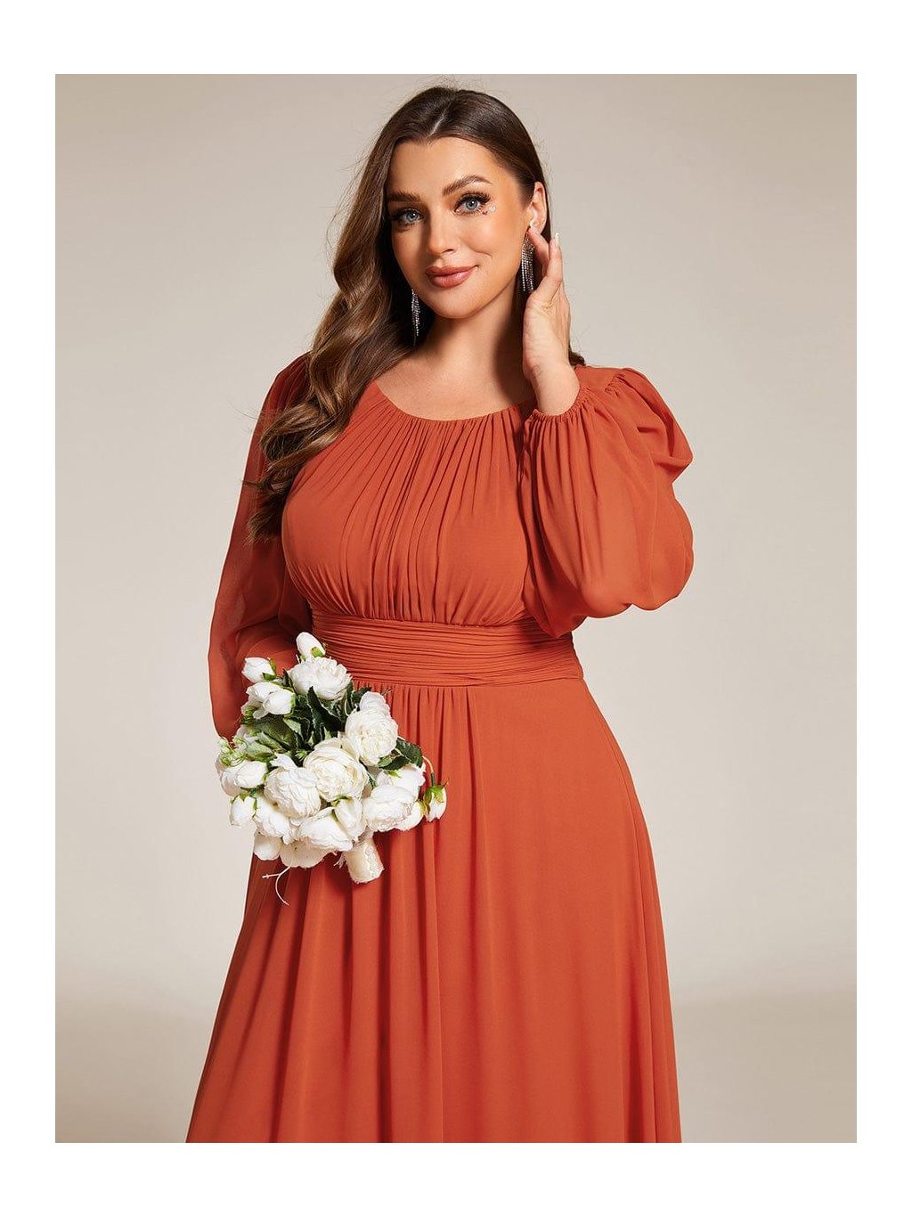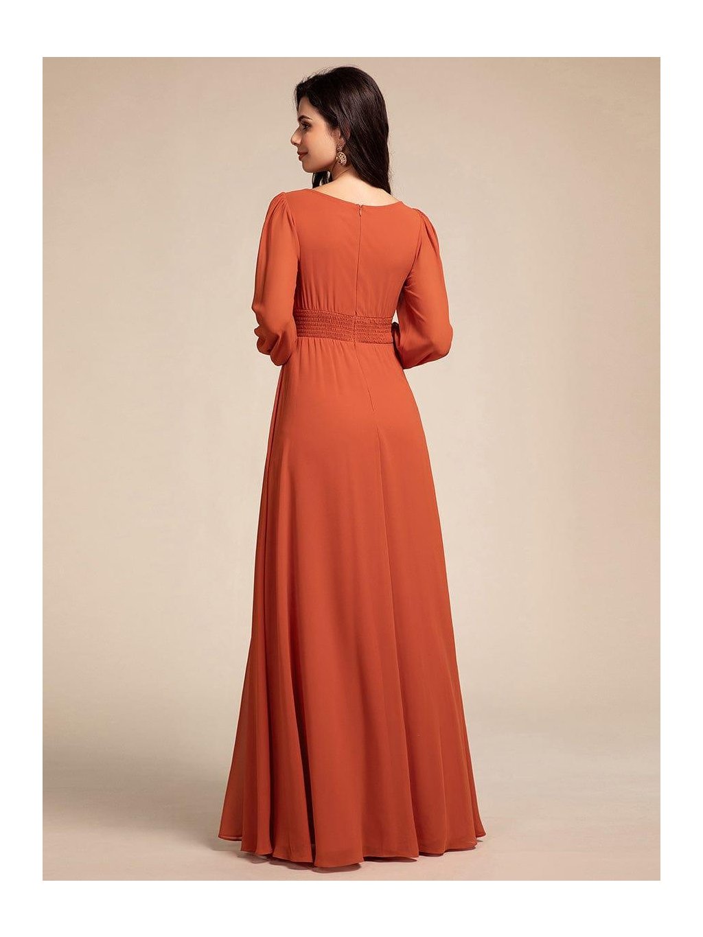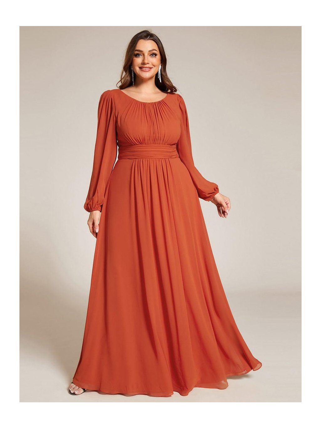 Barva zapadajícího slunce, lehkost pohybu a ženská silueta, která vynikne při každém kroku. Tyto dlouhé šaty v teplém oranžovém odstínu působí romanticky a přitom velmi přirozeně. Jemně řasený živůtek s kulatým výstřihem lichotí dekoltu, široce řasený pas krásně zvýrazní linii těla a splývavá sukně se ladně rozvíjí až k zemi. Dlouhé rukávy zakončené manžetou přinášejí jemnost i pohodlí během celého večera. Skvělá volba na jarní svatbu, ples, slavnostní večeři i focení při zlaté hodince – model, který si zamilujete pro jeho lehkost i výraznou barvu.