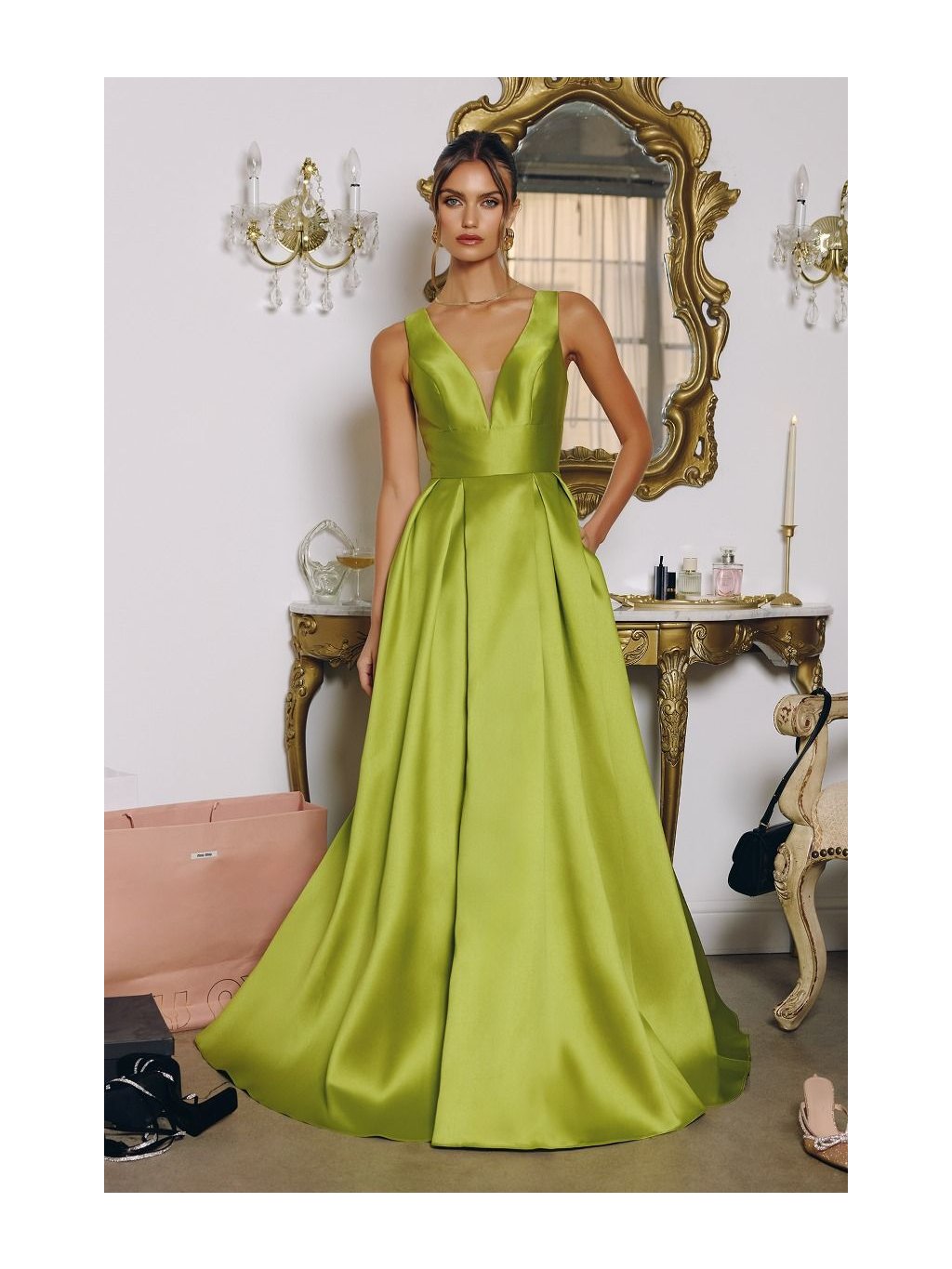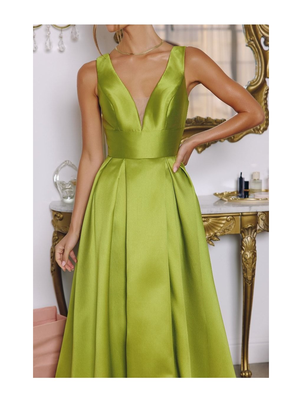 Tyto dlouhé šaty v luxusním zeleném odstínu zaujmou na první pohled svou čistou linií a nadčasovou elegancí. Hladký saténový materiál s jemným leskem krásně odráží světlo a dodává modelu sofistikovaný vzhled. Hluboký V výstřih s jemnou vsadkou působí svůdně, ale stále velmi vkusně. Přiléhavý živůtek zvýrazňuje pas, zatímco bohatě rozšířená sukně vytváří nádherný splývavý efekt při chůzi. Šaty mají široký pasový lem zajišťující perfektní siluetu. Ideální volba například na plesy a galavečery.