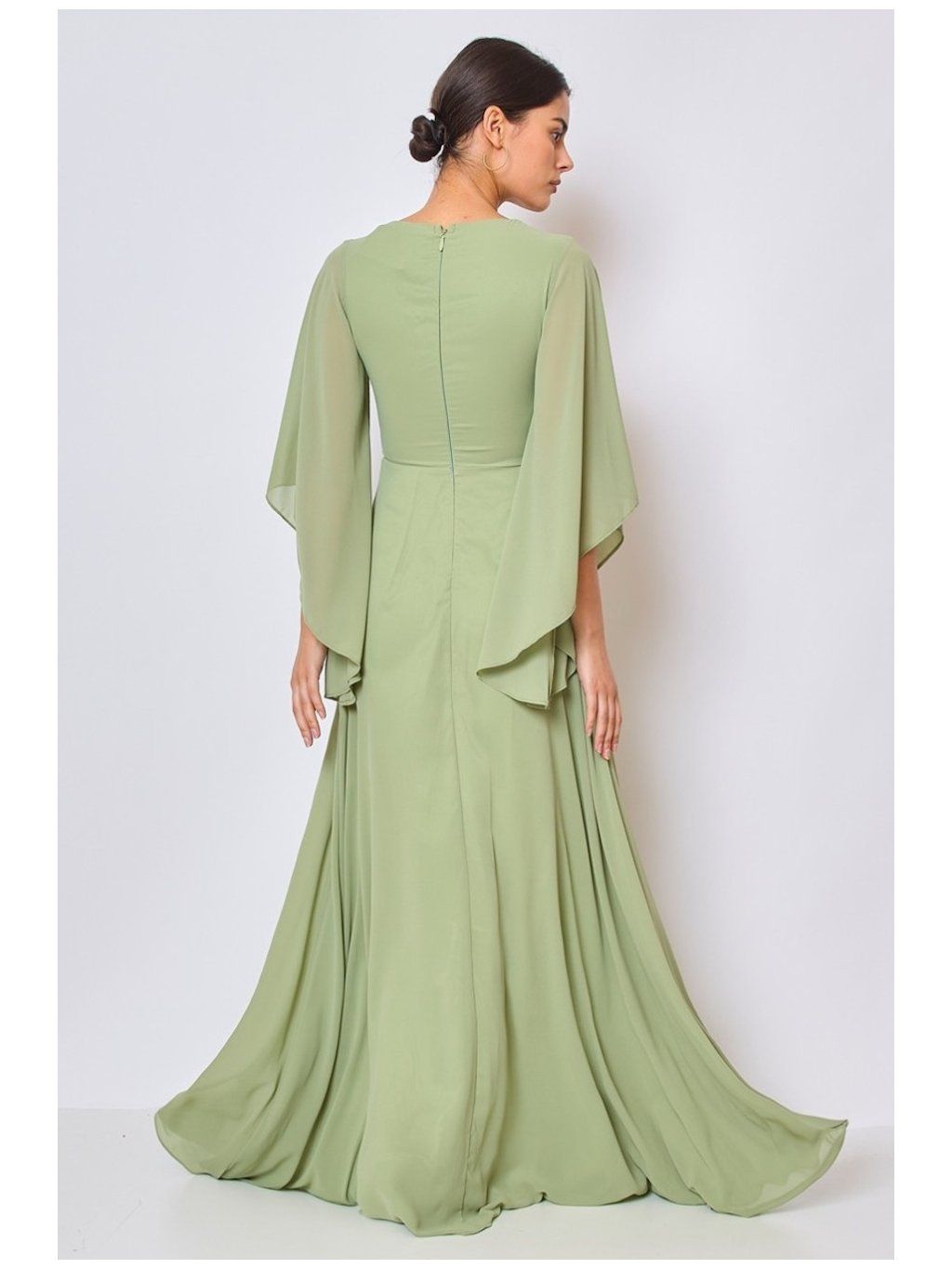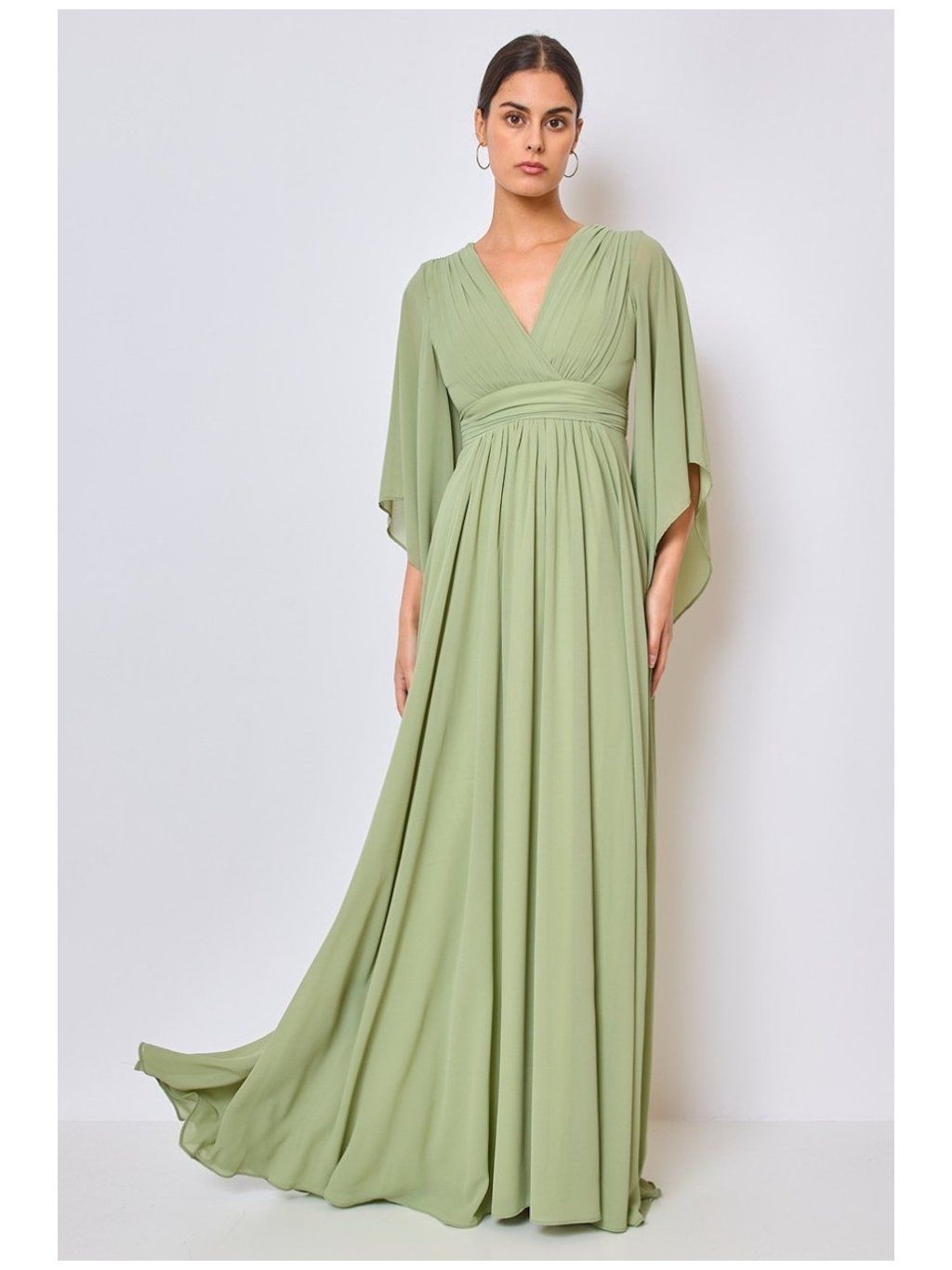 Dlouhé šaty v pastelově zeleném tónu působí velmi lehce a vzdušně, skvěle se hodí na svatby pod širým nebem - pro družičky nebo svatební hosty. Překládaný výstřih do V v kombinaci s jemným řasením přirozeně tvaruje dekolt a opticky prodlužuje horní část postavy. Zvýrazněný pas pak vytváří harmonickou siluetu. Šifonový materiál je lehký, splývavý a krásně reaguje na pohyb. Rukávy jsou volné, sahají pod lokty a díky své šířce vytvářejí elegantní efekt.