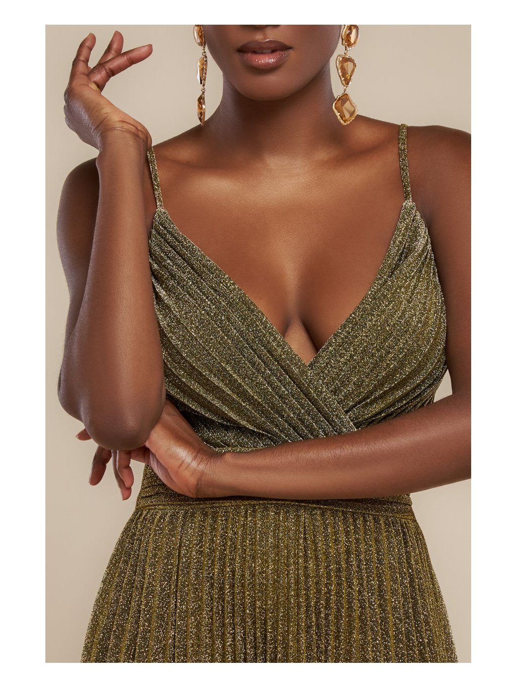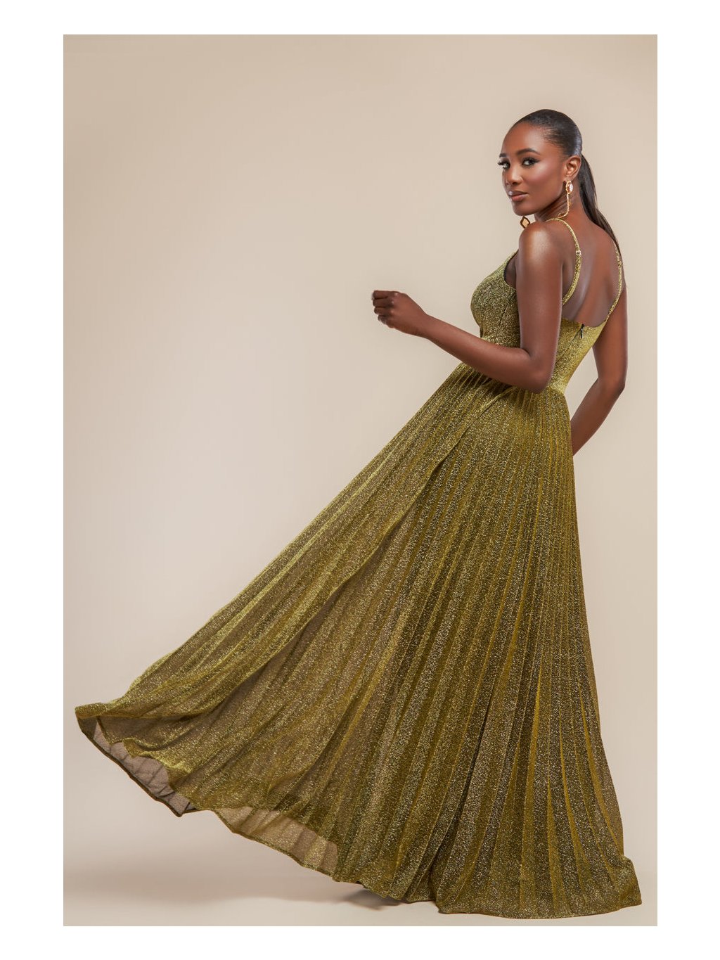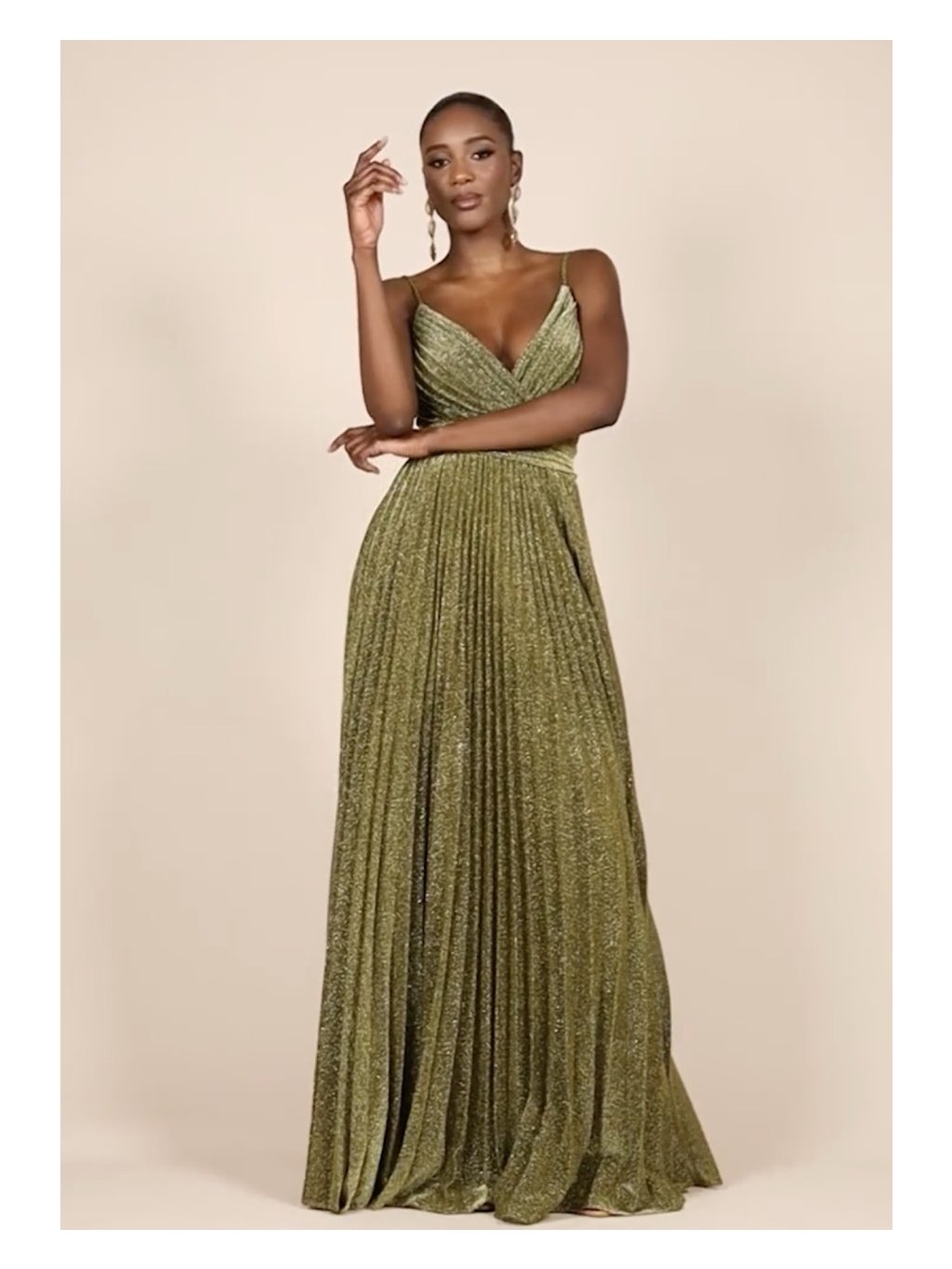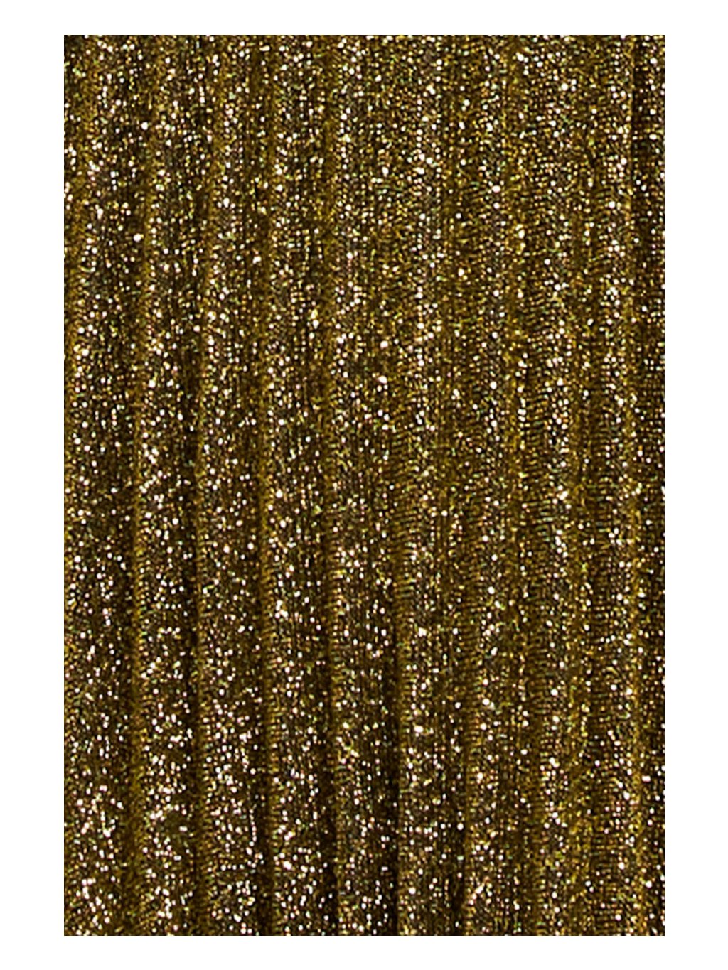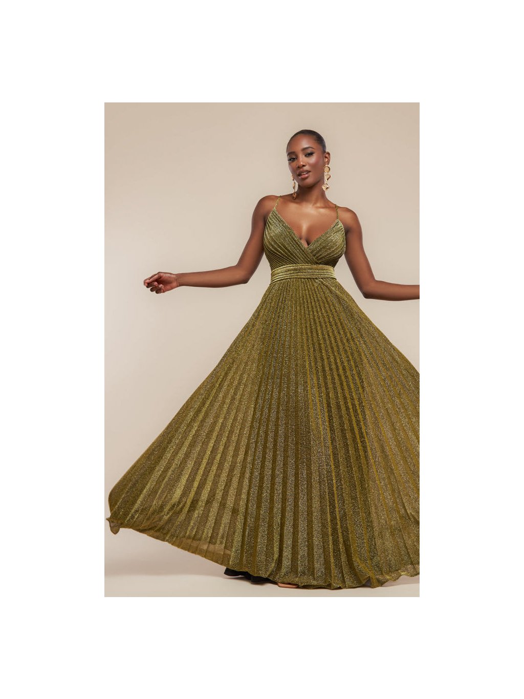Tyto zlaté plisované šaty okamžitě zaujmou svým výrazným třpytem a ženskou siluetou. Překřížený výstřih do V zvýrazňuje dekolt, zatímco tenká ramínka nechávají vyniknout ramenům. Plisovaná sukně se při chůzi efektně vlní a dodává celému modelu lehkost i eleganci. Zvýrazněný pas krásně formuje postavu a opticky prodlužuje nohy. Díky zářivému odstínu jsou šaty ideální na plesy, galavečery, slavnostní hostiny i večerní události, kde chcete působit výrazně a přitom velmi vkusně.