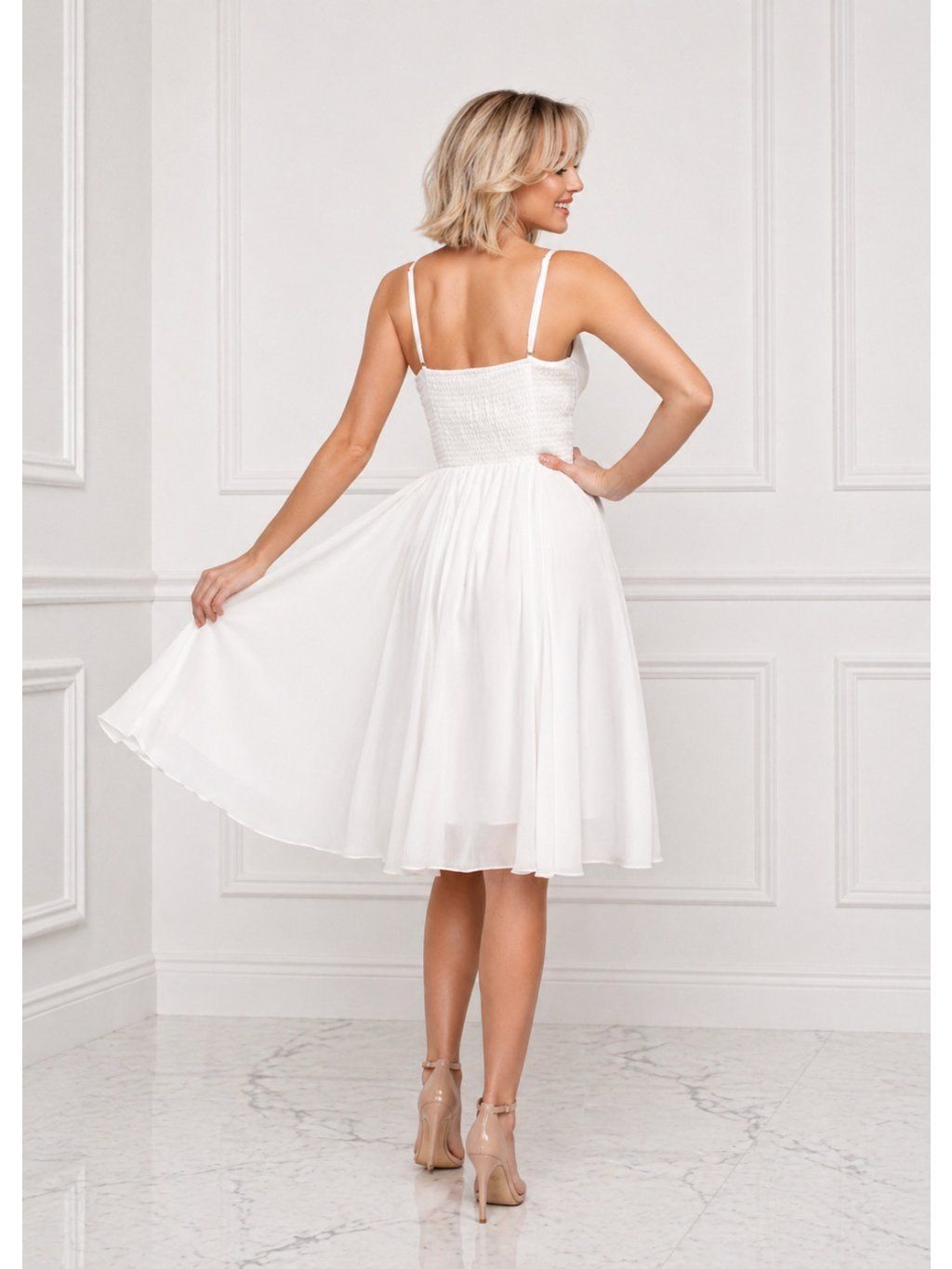 Lehké a elegantní šaty v jemném bílém odstínu jsou ideální volbou pro svatební příležitosti, popůlnoční převlečení i stužkovou. Tenká ramínka a tvarovaný živůtek s jemným řasením krásně zvýrazní dekolt a podtrhnou ženskou siluetu.